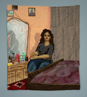 "Afghan Canadian artist Hangama Amiri combines painting and printmaking techniques with textiles, weaving together stories based on memories of her homeland and her diasporic experience. Amiri fled Kabul with her family in 1996 when she was seven years old. Moving through numerous countries over several years, they immigrated to Canada in 2005 when Amiri was a teenager. Amiri’s choice of materials stems from autobiographical origins—her mother taught her to sew and her uncle was a tailor. Her textiles also reference the colors and fabrics she remembers in the bazaars and on the streets in Kabul. She sources her materials from an Afghan-owned shop in New York City’s fashion district, collaging with fabric and painting on the surfaces. Large-scaled with frayed edges, Amiri’s textile works are made from layering fabrics, piecing and sewing them together, so the fragments collectively characterize her home from a distance. Centered on the lives of women, she builds interiors that capture her protagonists within domestic and entrepreneurial spaces and amplify a collective struggle for women’s rights in Afghanistan and around the world." By Amy Smith-Stewart (Chief Curator at The Aldrich Contemporary Art Museum)