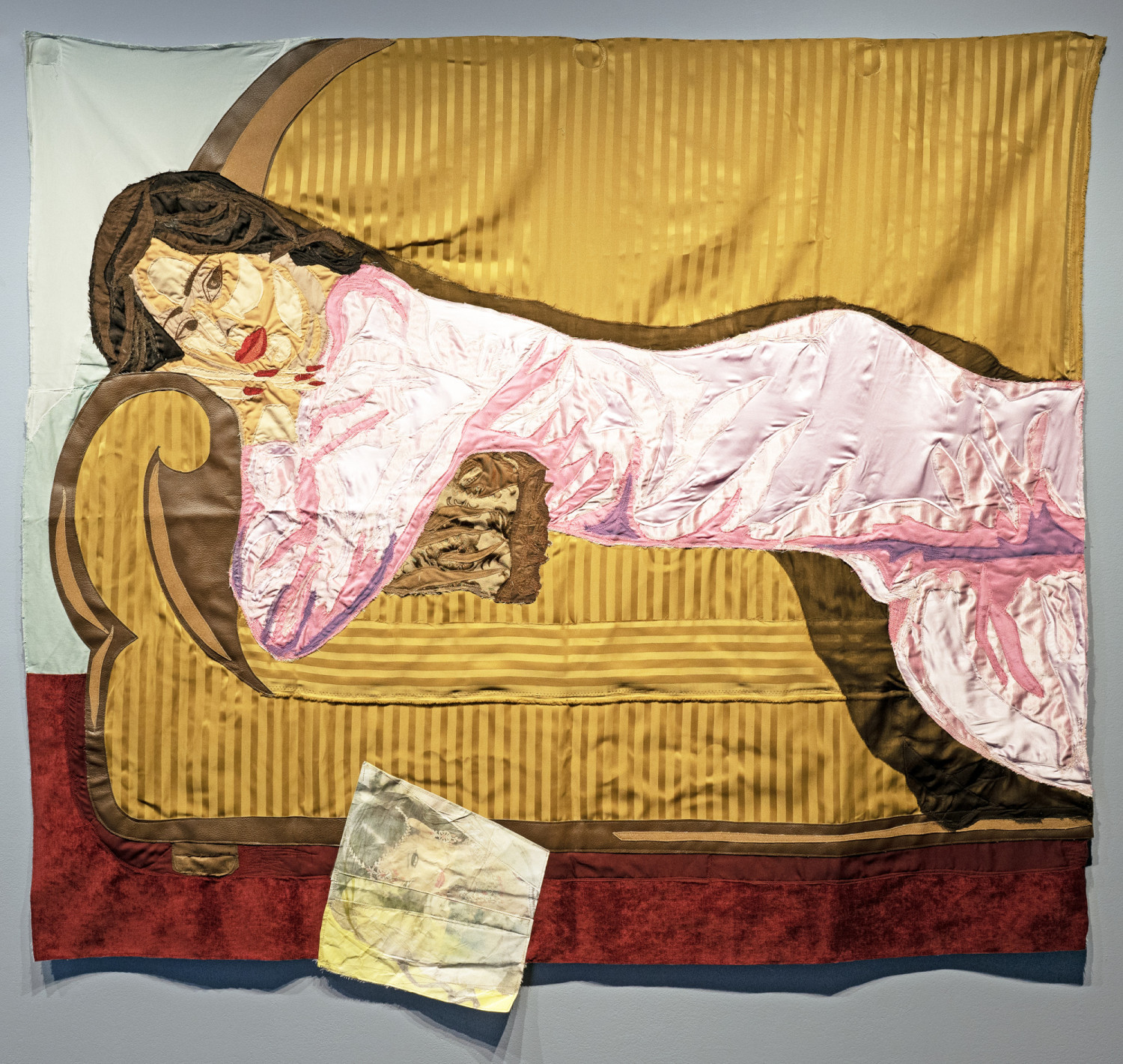 Reclining Woman on a Sofa. 2022 – Muslin, cotton, polyester, chiffon, silk, gauze cotton, inkjet silk print, paper, velvet, denim, suede, faux leather, and found fabric – 55" x 59.5"
