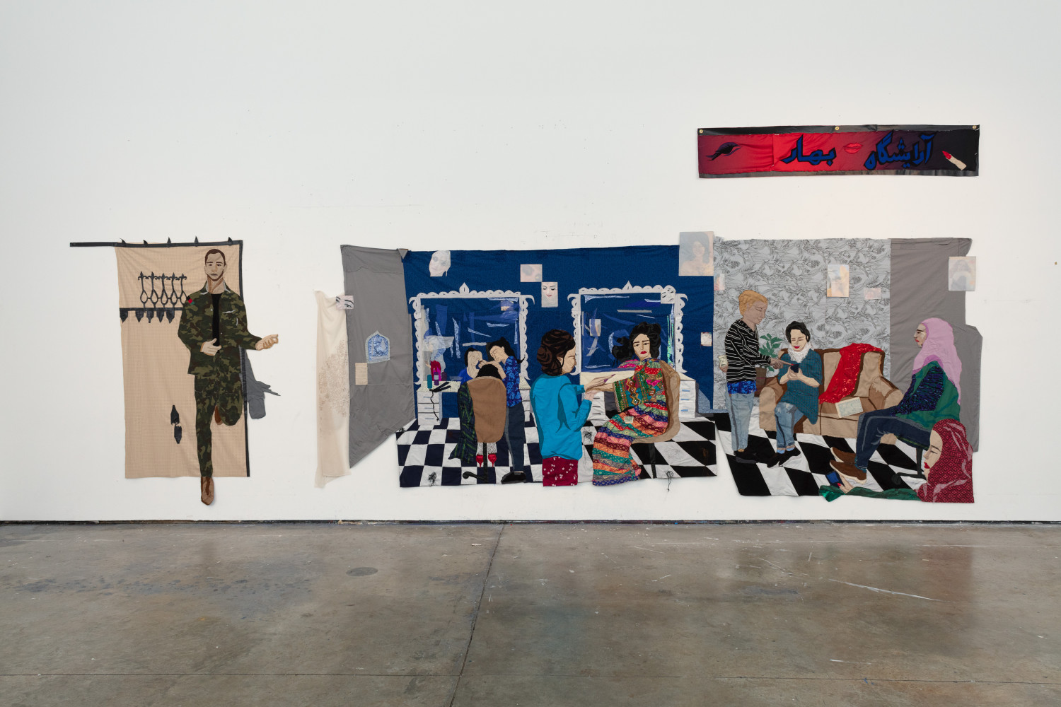 Arayeshgah-e Bahar (Bahar, Beauty Parlor). 2019 – chiffon, cotton, suede, silk, denim, mesh-screen textile, shoelace, hanging wires, bamboo cord, printed paper image, and found fabrics – 117" x 288"