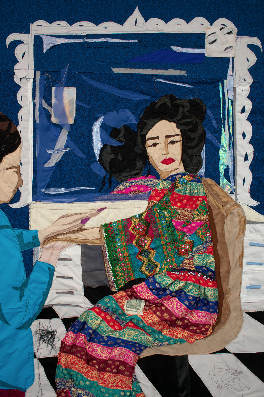 Untitled (detail). 2019 – chiffon, cotton, suede, silk, denim, mesh-screen textile, shoelace, hanging wires, bamboo cord, printed paper image, and found fabrics – 117" x 288"