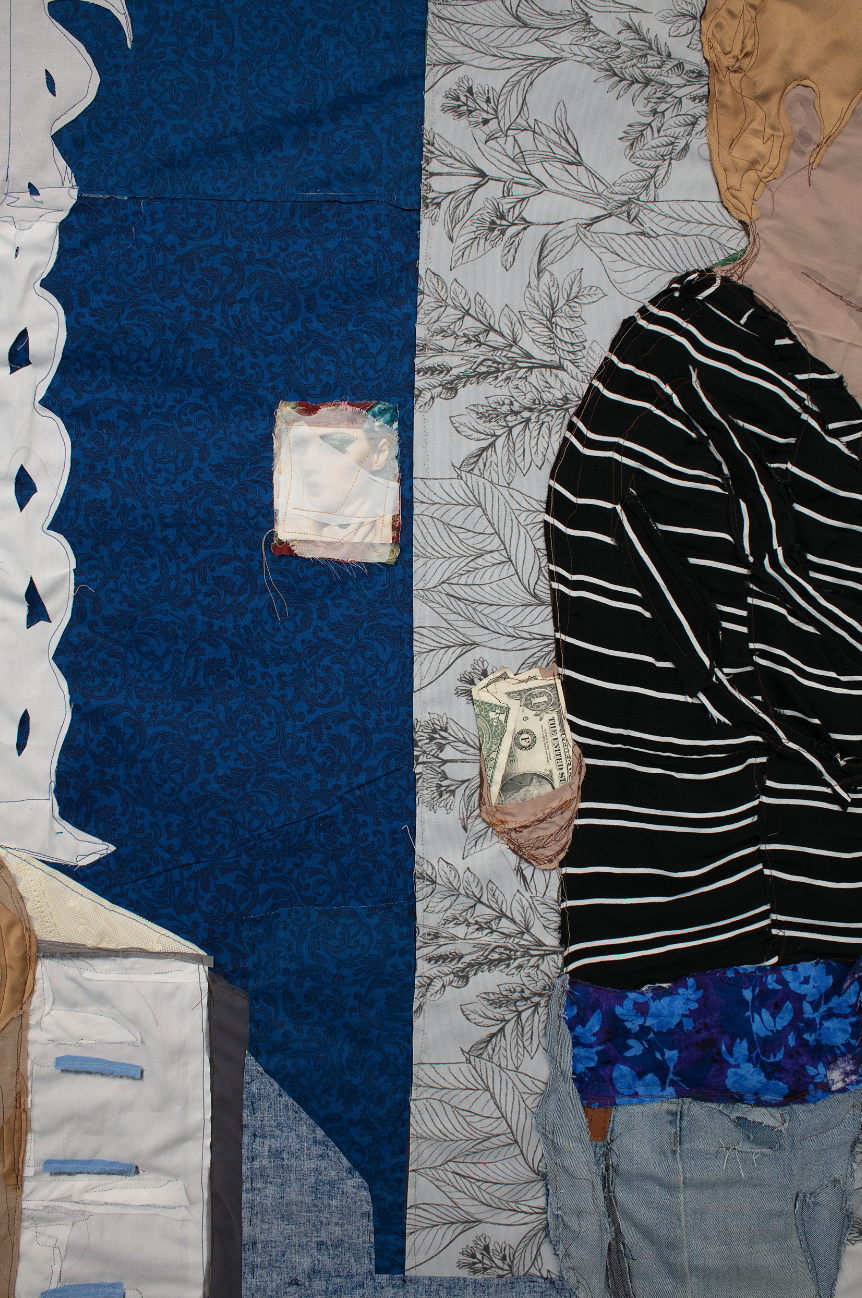 Untitled (detail). 2019 – chiffon, cotton, suede, silk, denim, mesh-screen textile, shoelace, hanging wires, bamboo cord, printed paper image, and found fabrics – 117" x 288"