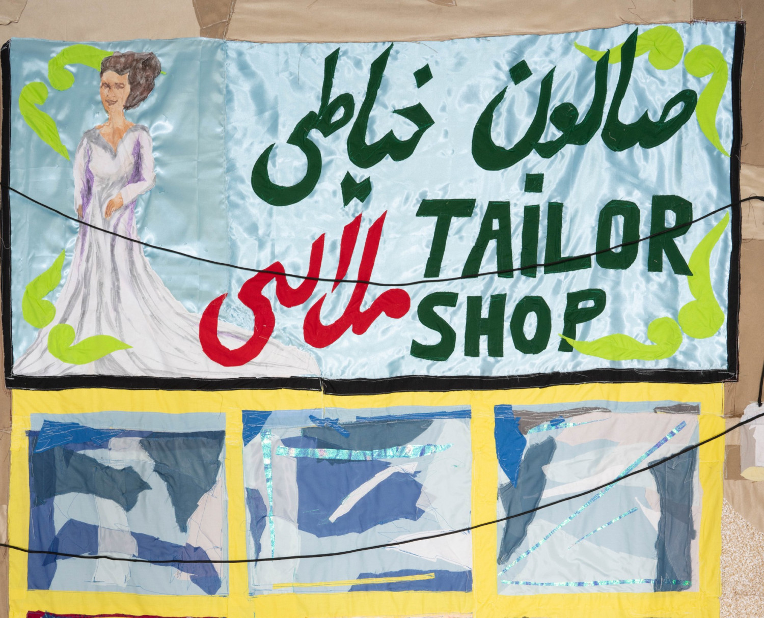 Malalai, Tailor Shop (detail). 2020 – cotton, chiffon, muslin, silk, suede, handmade Afghan embroidered fabric, shoelaces, acrylic paint, lace, gouache, marker, polyester, camouflage fabric, iridescent paper, and found fabric – 108" x 85"