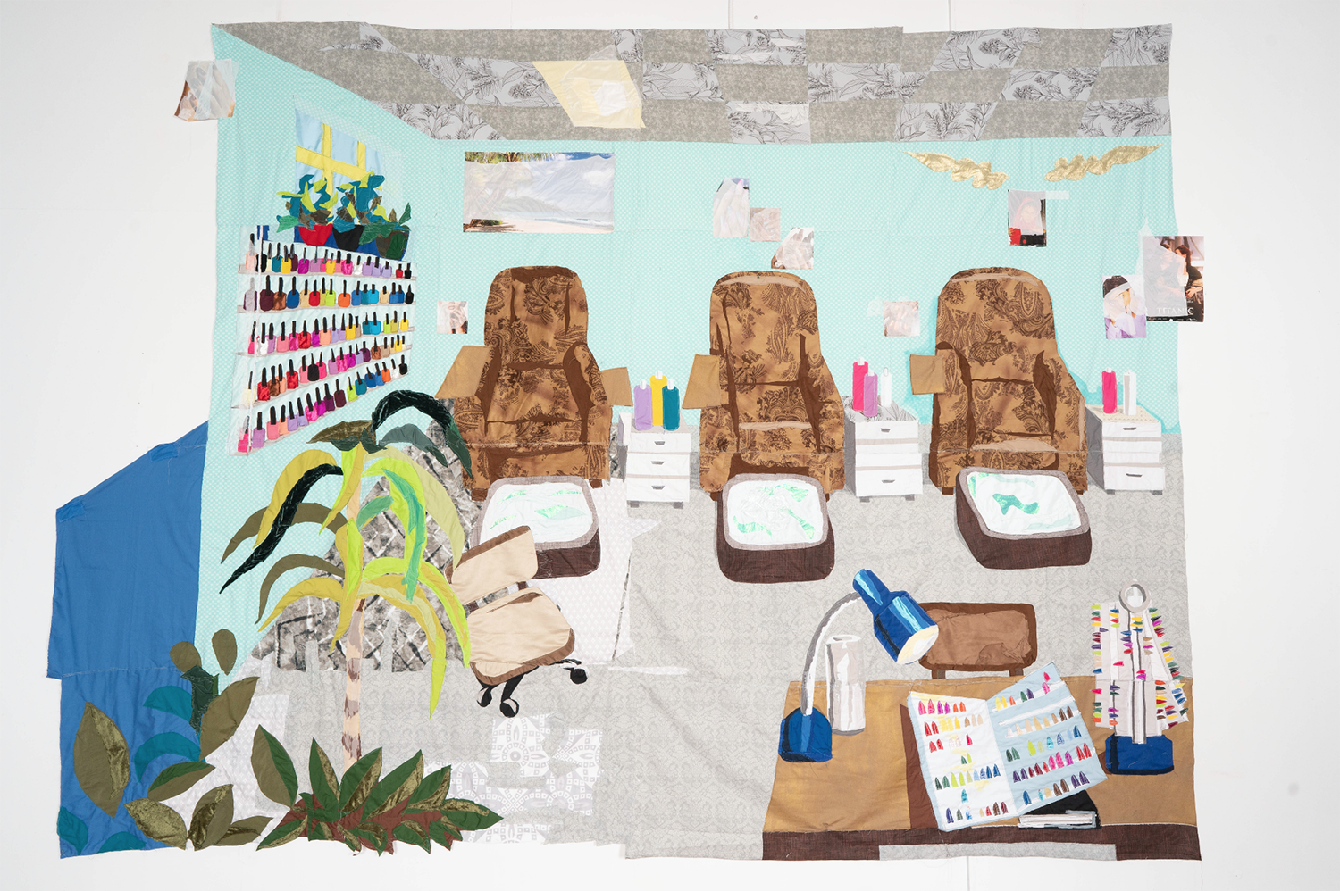Sahar, Nail Salon #1 (detail). 2020 – cotton, chiffon, muslin, silk, suede, paper, clear plastic, inkjet prints on paper, marker, polyester, and found fabric – 111" x 152.5"
