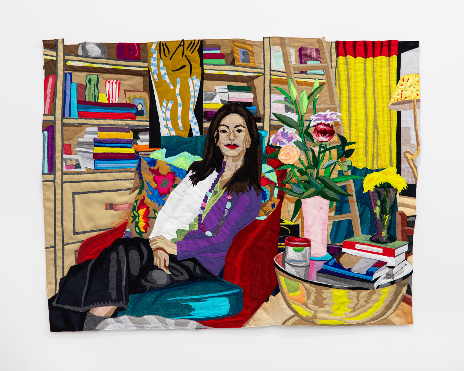 Sara Tayeb-Khalifa at Her Apartment in Manhattan. 2024 – Muslin, cotton, chiffon, silk, polyester, velvet, denim, suede, color pencil on fabric, and hand-embroidery and found fabric – 44.5''H x 56''W