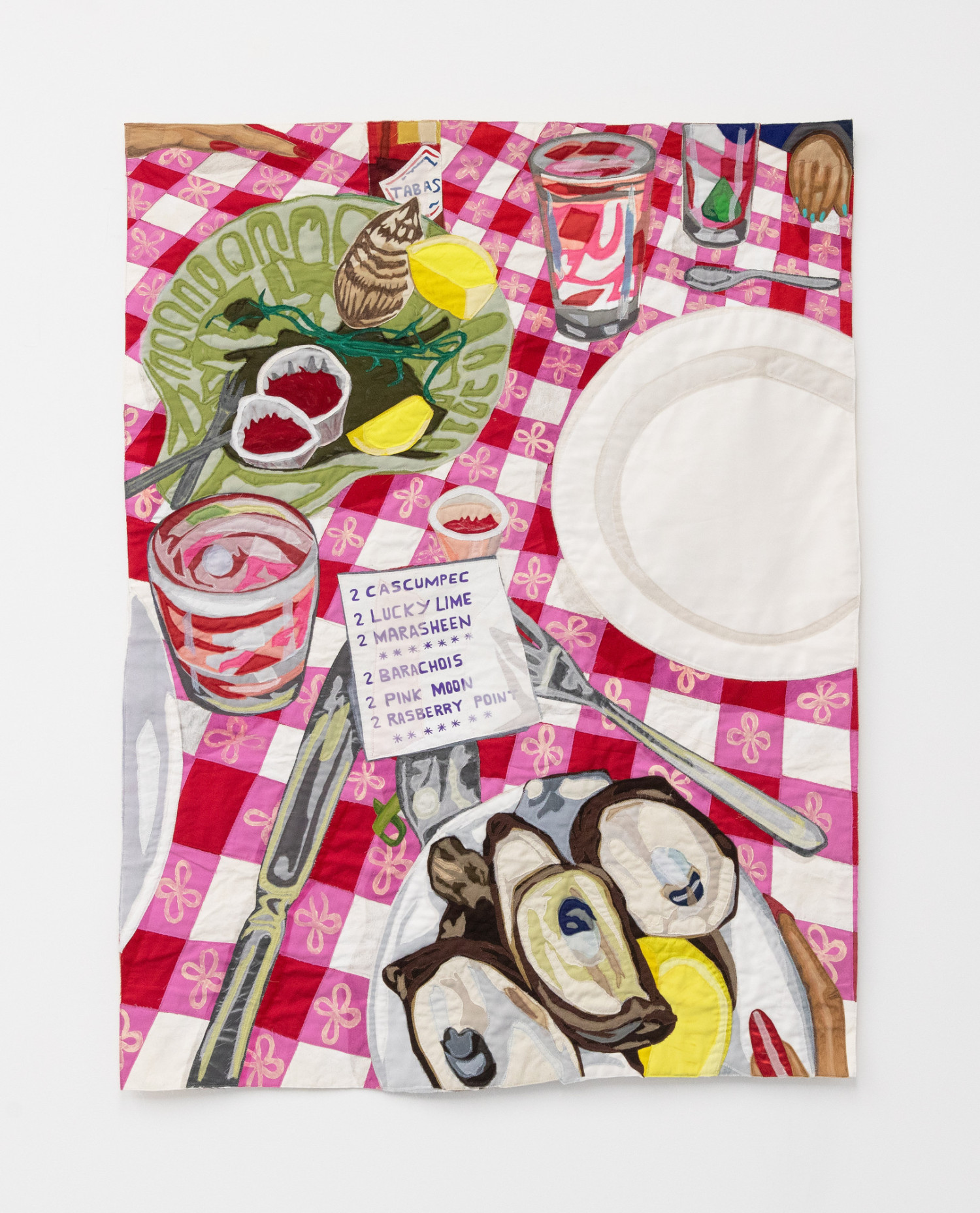Still-life with Oysters and Lucky Lime. 2025 – Muslin, cotton, polyester, chiffon, silk, linen, color-pencil, block-print and acrylic paint on fabric – 48''H x 36''W