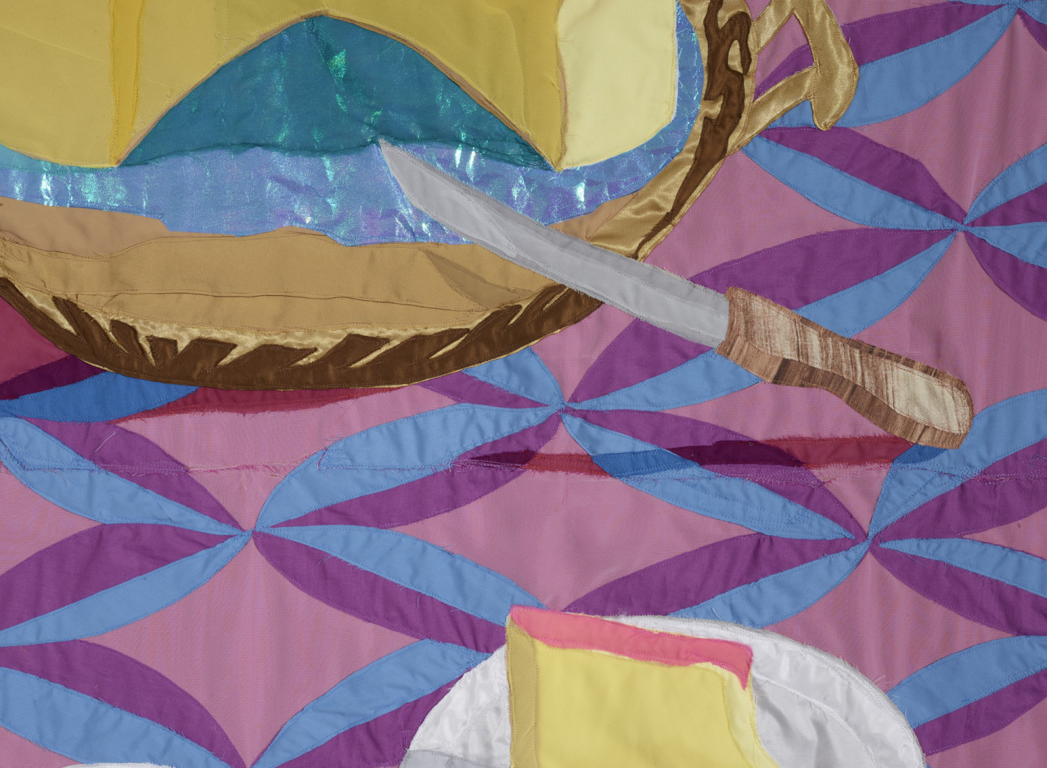 Still-Life with Vanilla Cake (detail). 2022 – Chiffon, muslin, cotton, polyester, silk, iridescent paper, suede, and found fabric – 50" X 61"