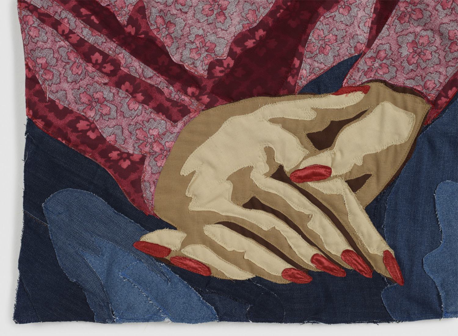 Two Seated Women (detail). 2022 – Chiffon, muslin, cotton, polyester, silk, denim, and found fabric – 30" X 33"