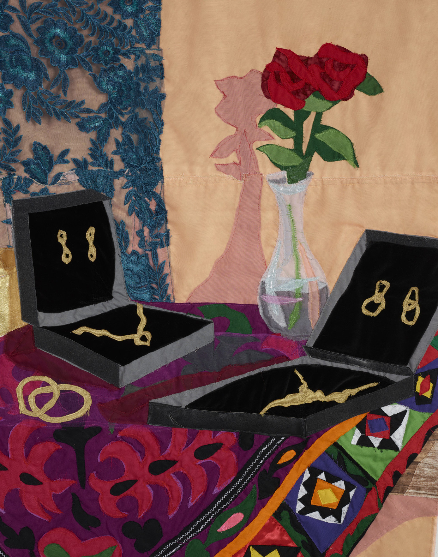 Still-Life with Jewelry boxes and Red Roses (detail). 2022 – Chiffon, muslin, cotton, polyester, silk, inkjet print on chiffon, suede, color pencil, and found fabric – 62" X 53.5"