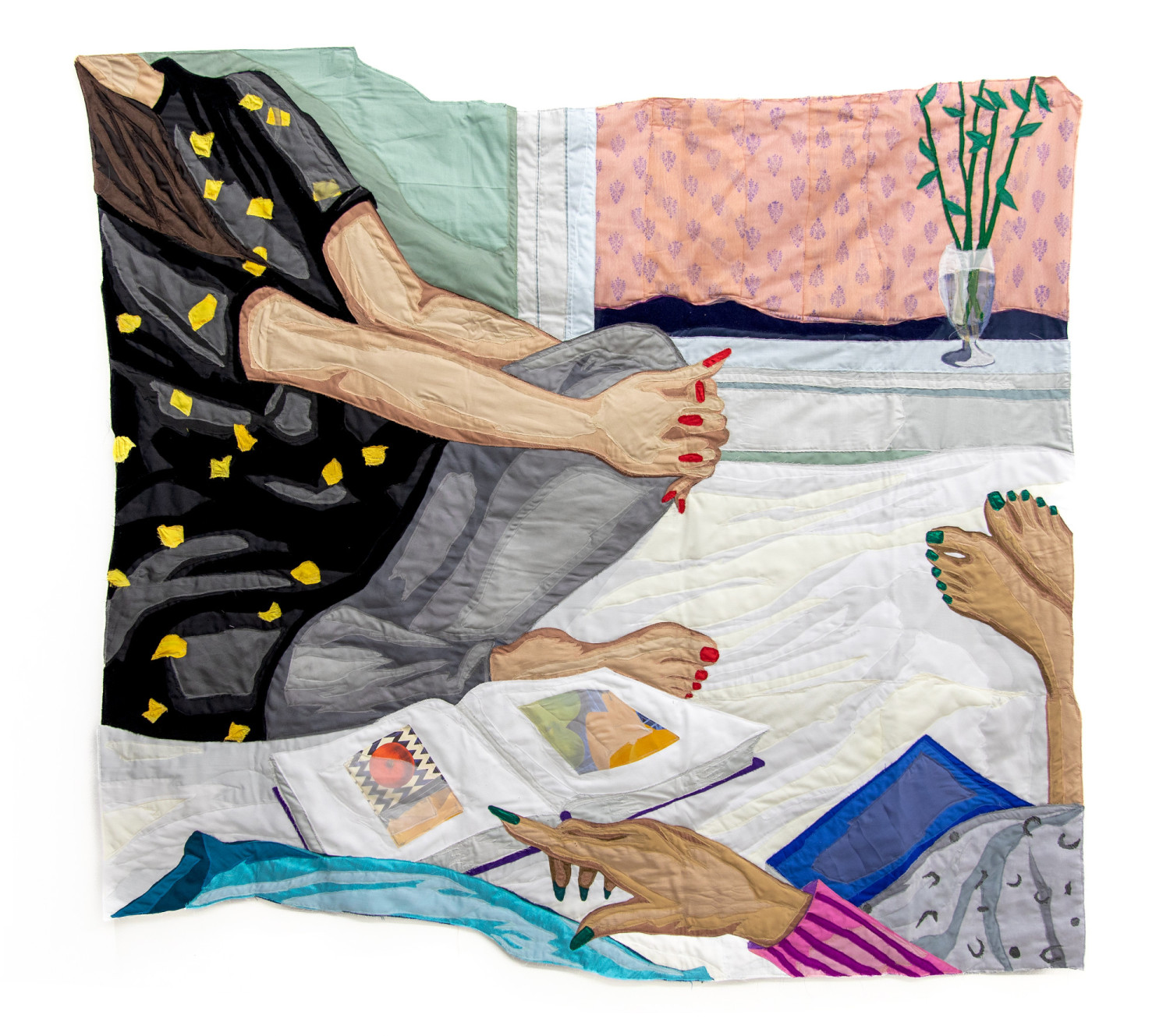 Portrait of Two Artists looking at Art Book. 2023 – Muslin, cotton, chiffon, polyester, silk, sari, velvet, linen, polyester, Inkjet print on linen paper and suede – 57” H X 62” W