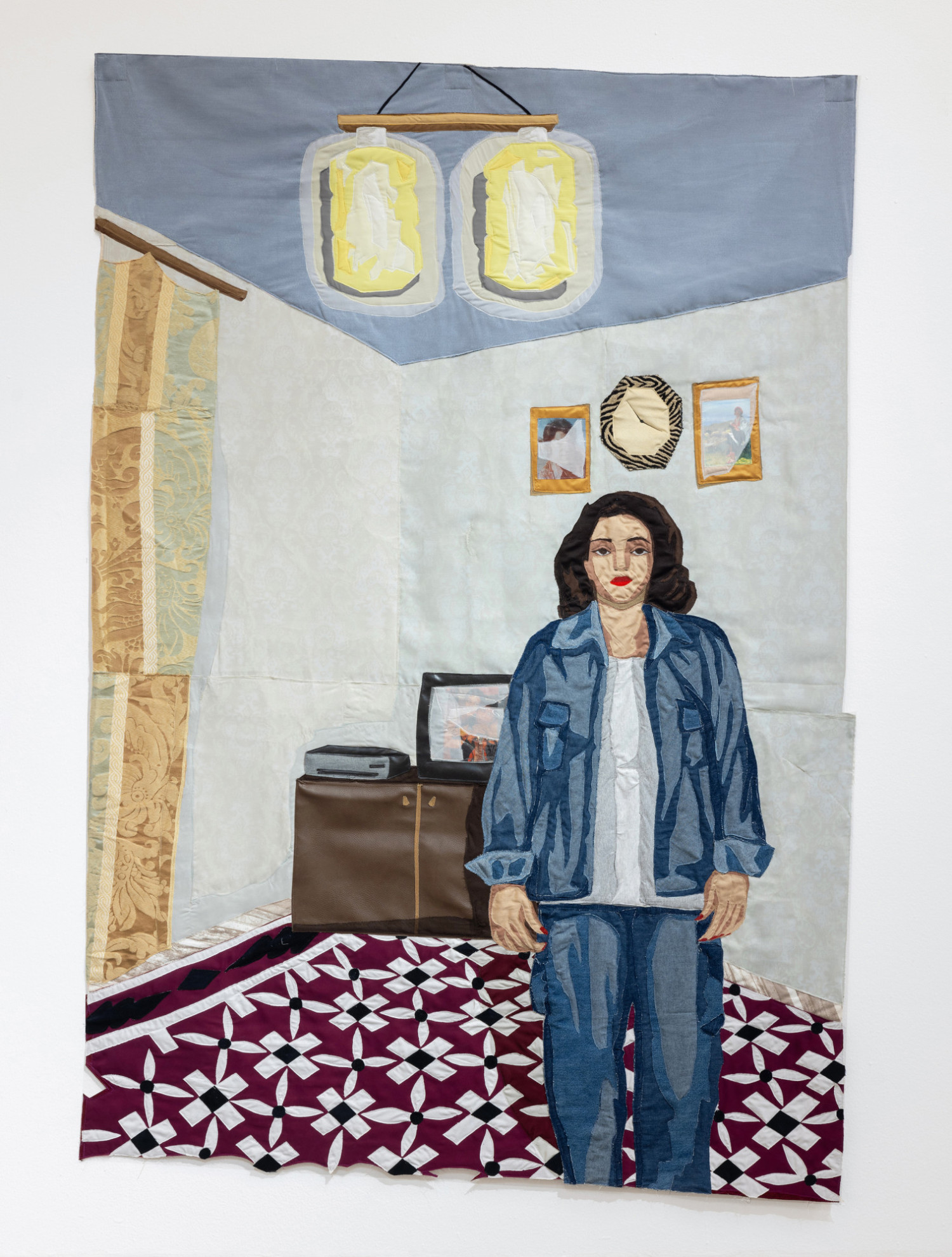 Portrait of a Woman with Denim Jacket. 2023 – muslin, cotton, chiffon, polyester, suede, wallpaper, faux leather, vinyl paper, clear vinyl, Kodak photo, postcard, silk-chiffon, velvet – 75"H X 70.5"W