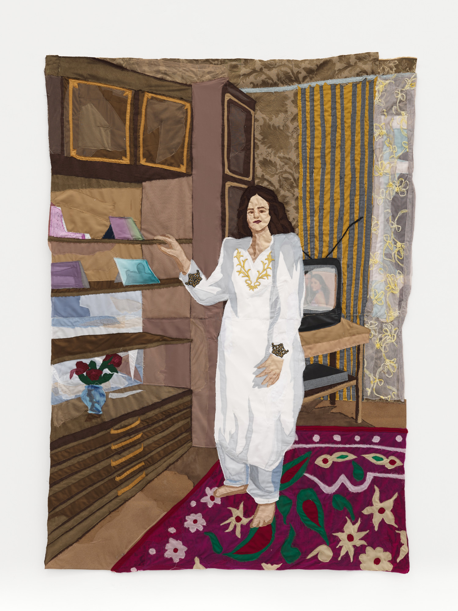 Portrait of a Woman in White Salwar Kameez. 2022 – Muslin, cotton, polyester, dyed fabric, velvet, chiffon, sued, leather, mesh-fabric, embroidery pattern, inkjet print on silk-chiffon, silk, color pencil, and found fabrics – 72” x 52”