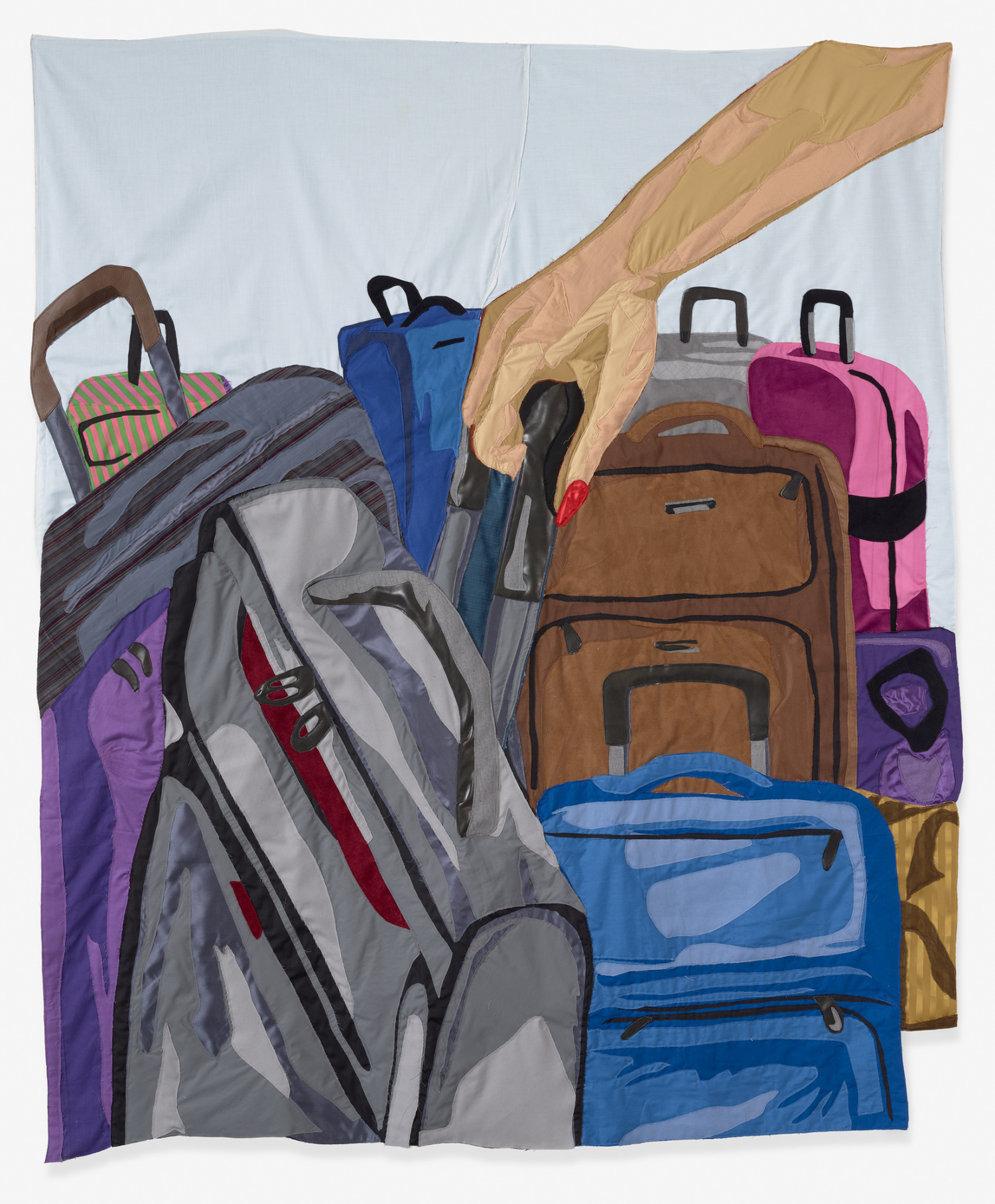 Still-Life with Travel Luggage. 2023 – Muslin, cotton, polyester, silk, velvet, suede, leather, and chiffons – 674”H x 62.5”W