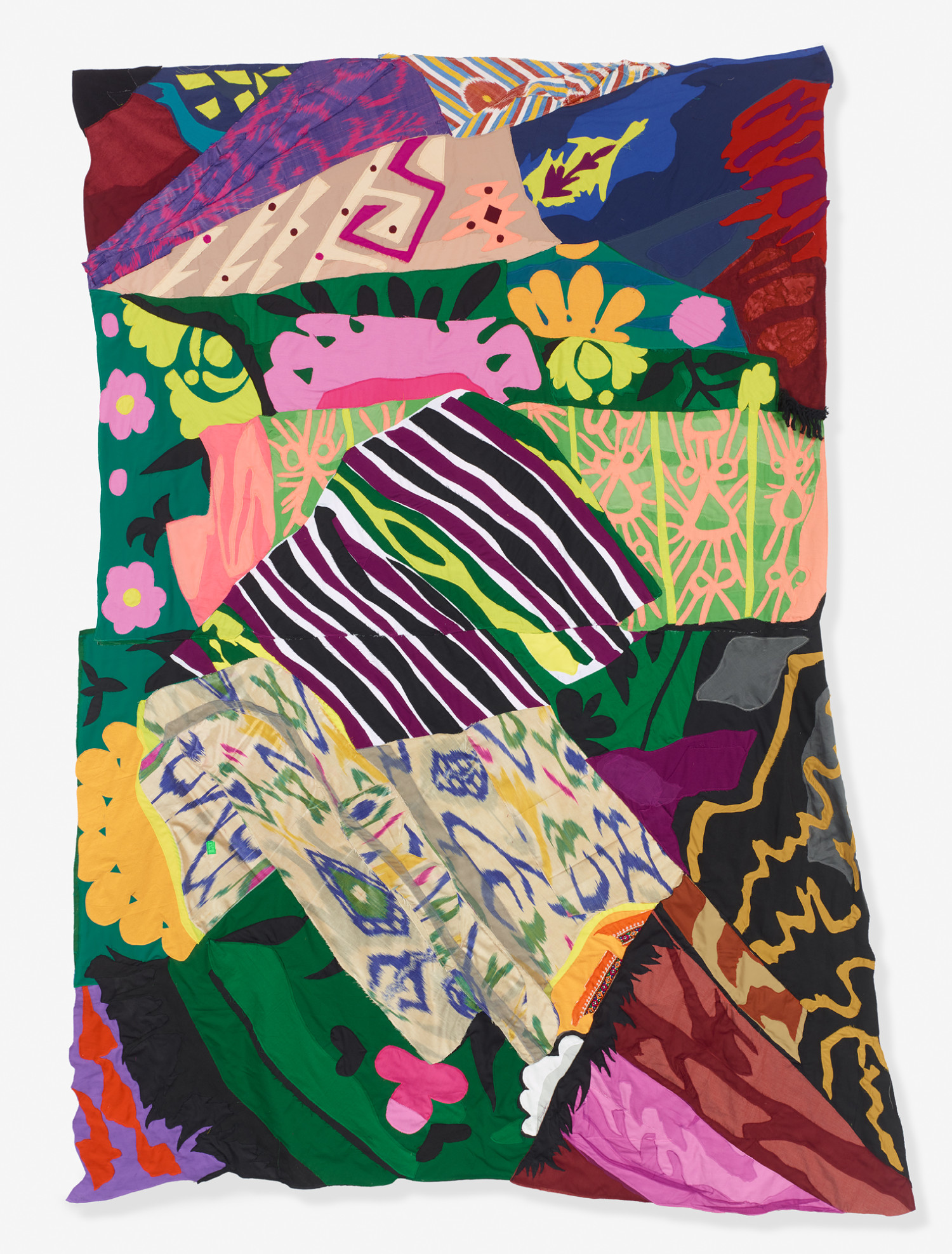 Still-Life with Ikat-Prints and Afghan-Suzani fabrics. 2023 – Muslin, cotton, silk, polyester, ikat-print fabric, afghan-embroidery fabric, and chiffon – 102”H x 73”W