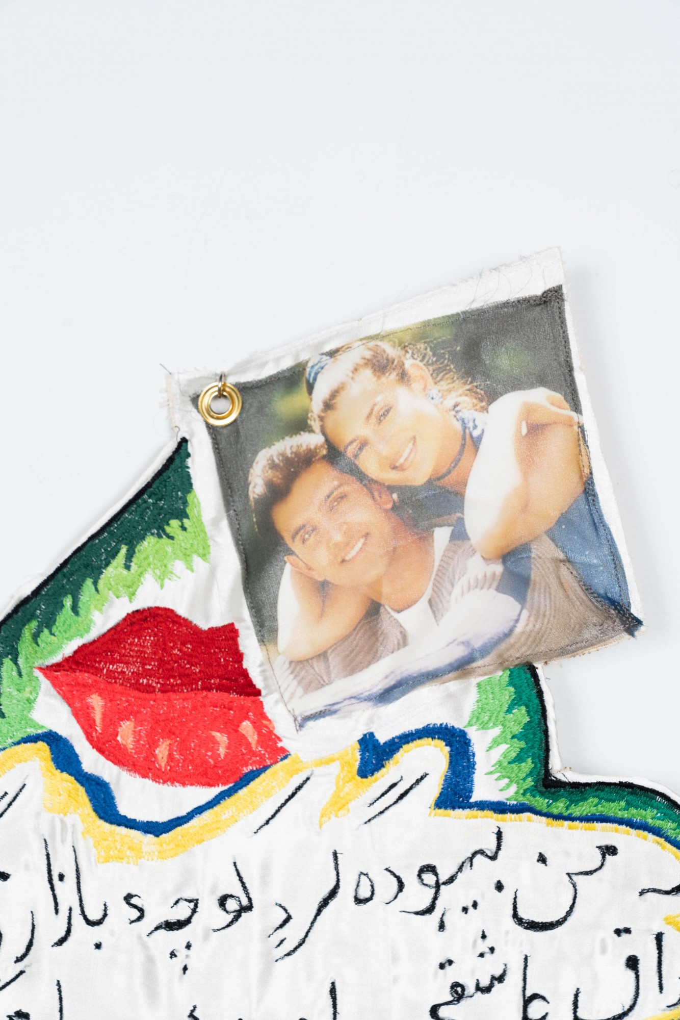 When I am With You (detail). 2021 – Inkjet print on silk, canvas, and embroidery on satin – 28'' x 22.5''