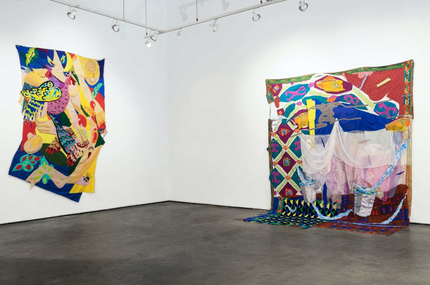 Installation view. 2019 – gouache paint, brown paper, and Afghan embroidered fabric