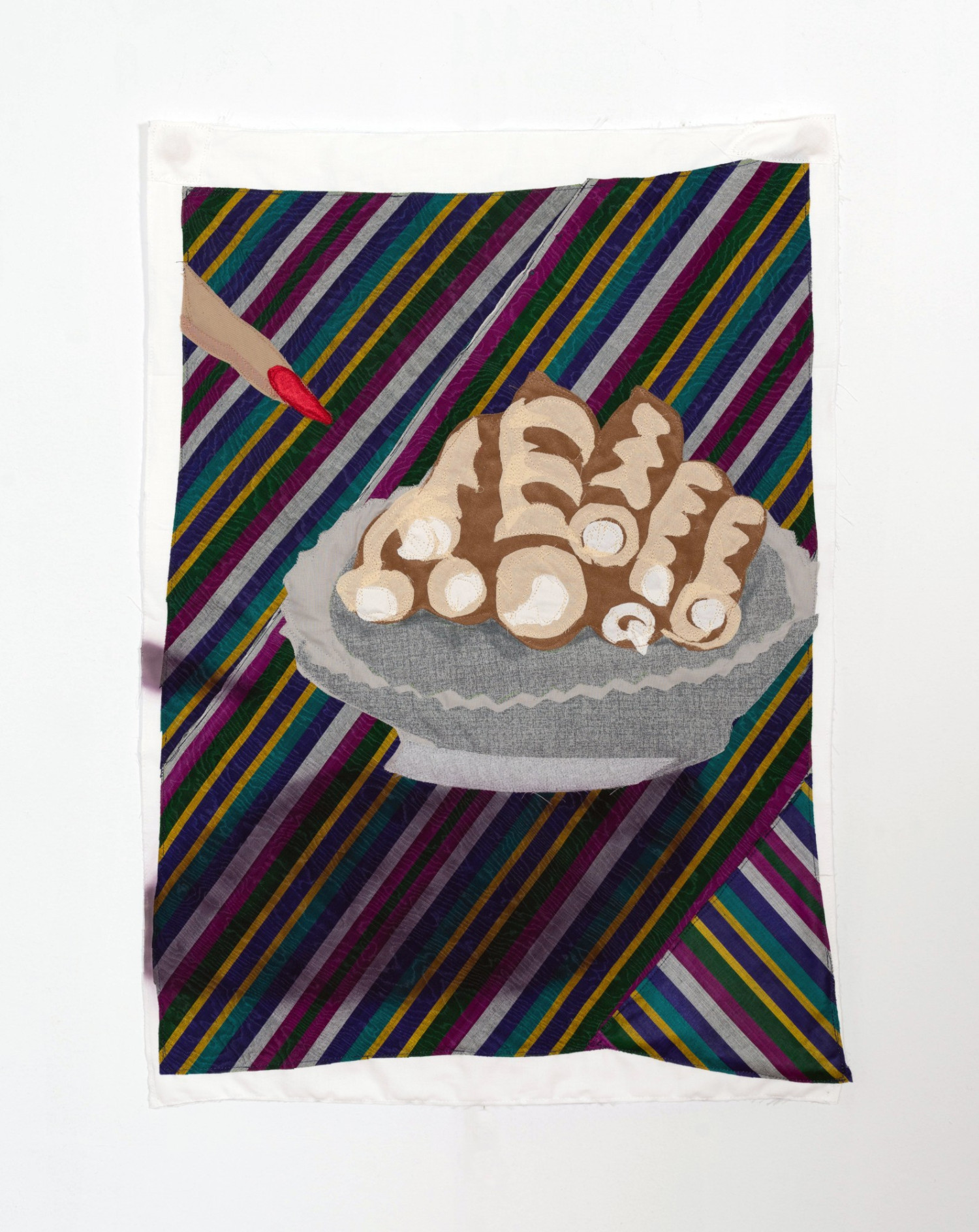 Afghan creamroll. 2021 – Chiffon, muslin, cotton, polyester, suede, marker, acrylic paint and handmade ikat print fabric – 30” x 21”