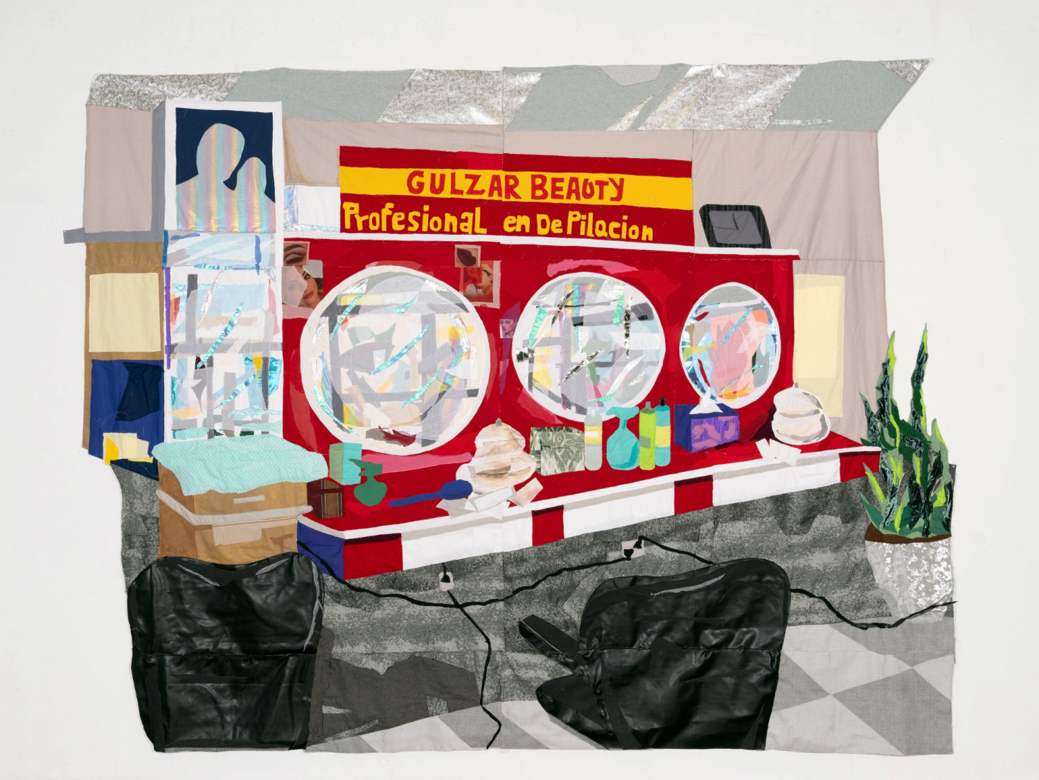 Gulzar, Beauty Salon. 2021 – Chiffon, muslin, cotton, polyester, velvet, silk, faux leather, inkjet print on chiffon, suede, iridescent paper, and found fabric – 110” x 144”