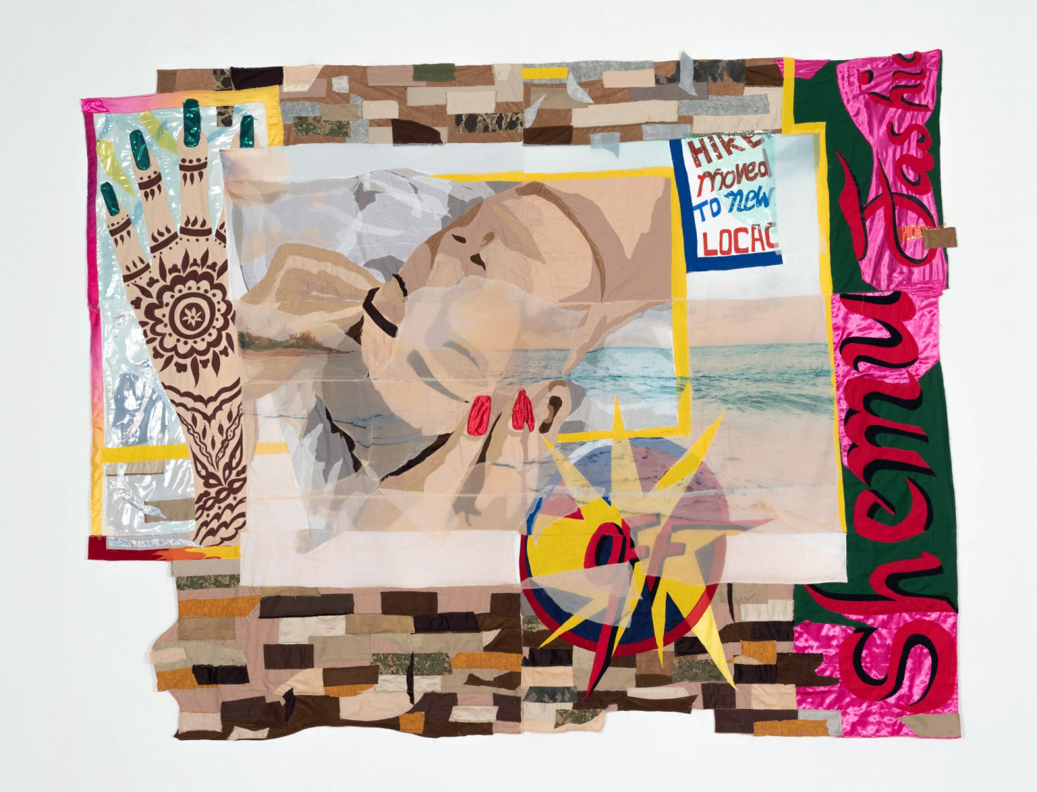 Rupture and Repair, 2021 – Chiffon, cotton, polyester, muslin, suede, inkjet print on chiffon, faux leather, camouflage, plastic film, silk, satin, and acrylic on fabric – 90” x 116”