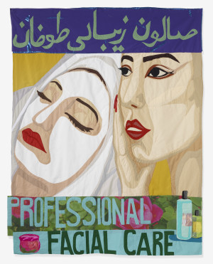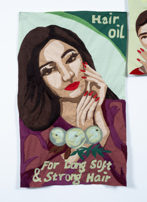 "Afghan Canadian artist Hangama Amiri combines painting and printmaking techniques with textiles, weaving together stories based on memories of her homeland and her diasporic experience. Amiri fled Kabul with her family in 1996 when she was seven years old. Moving through numerous countries over several years, they immigrated to Canada in 2005 when Amiri was a teenager. Amiri’s choice of materials stems from autobiographical origins—her mother taught her to sew and her uncle was a tailor. Her textiles also reference the colors and fabrics she remembers in the bazaars and on the streets in Kabul. She sources her materials from an Afghan-owned shop in New York City’s fashion district, collaging with fabric and painting on the surfaces. Large-scaled with frayed edges, Amiri’s textile works are made from layering fabrics, piecing and sewing them together, so the fragments collectively characterize her home from a distance. Centered on the lives of women, she builds interiors that capture her protagonists within domestic and entrepreneurial spaces and amplify a collective struggle for women’s rights in Afghanistan and around the world." By Amy Smith-Stewart (Chief Curator at The Aldrich Contemporary Art Museum)