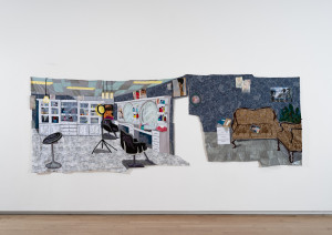 Facial Care, Beauty Salon. 2022 – Muslin, cotton, polyester, chiffon, suede, velvet, iridescent paper, inkjet print and found fabric – 85" x 66.5"