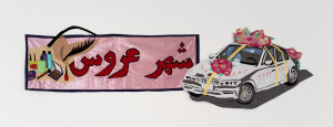 Arayeshgah-e Shahre Aroos/Brides Beauty Parlor. 2022 – Muslin, cotton, polyester, velvet, chiffon, silk, leather, suede, inkjet silk print, paper, postcard, iridescent paper, clear vinyl, denim, and found fabric – 63" x 184"