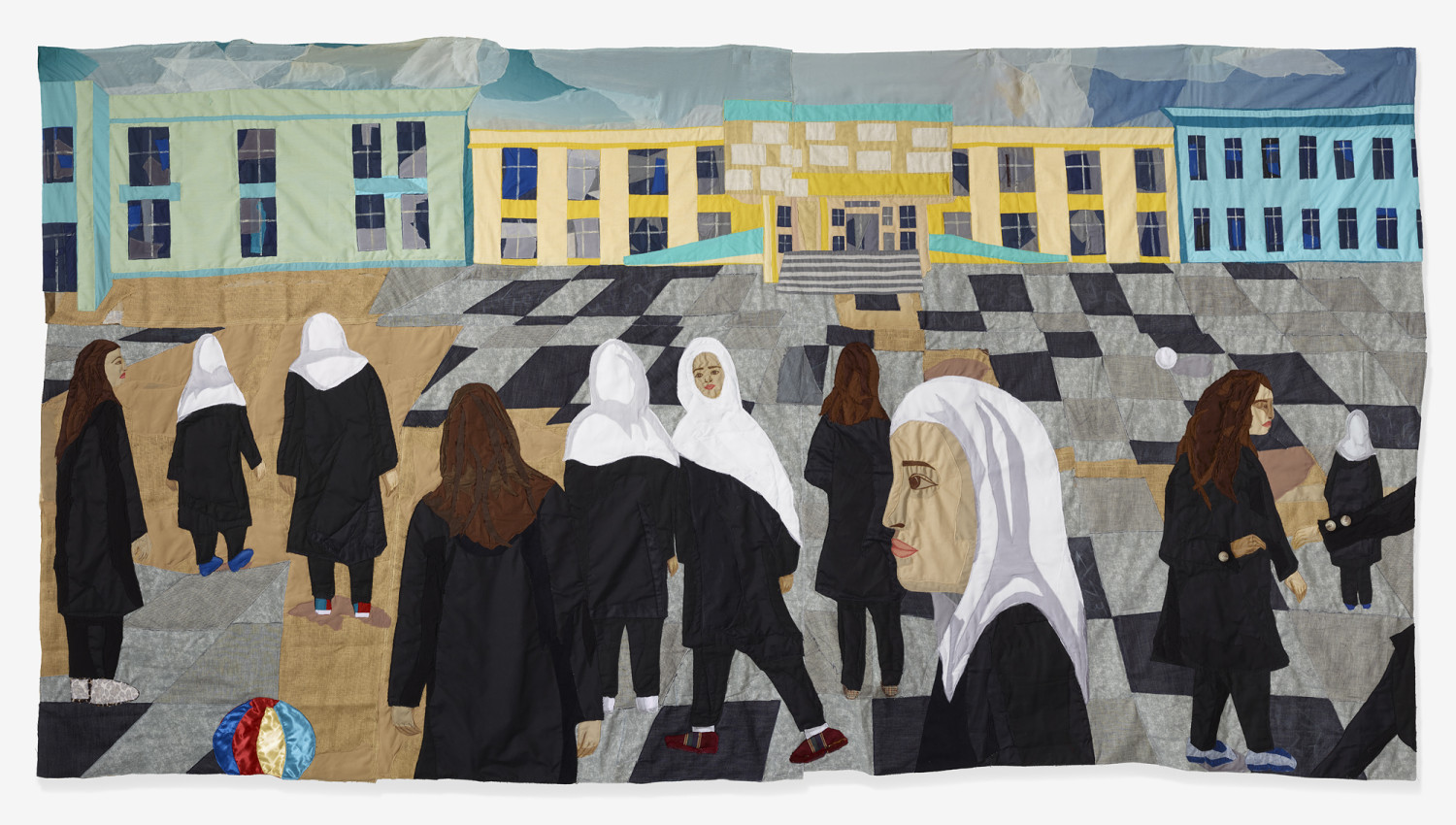Recess. 2022 – Muslin, cotton, chiffon, polyester, faux leather, denim, burlap, color pencil on fabric, acrylic paint, velvet and found fabric – 70.5" x 139.5"