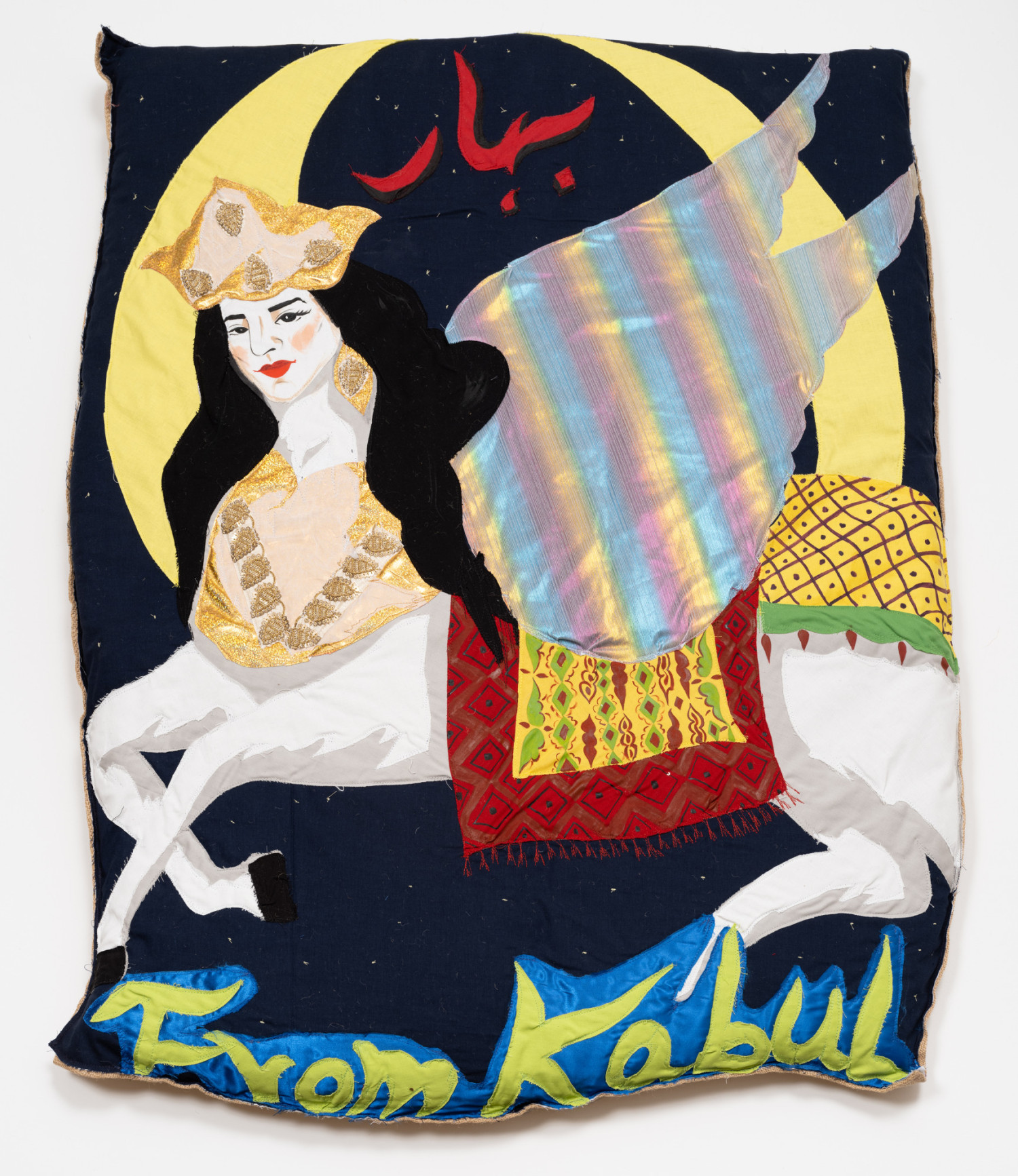 Bahar, From Kabul (Rice Sack #1). 2021 – Chiffon, muslin, cotton, polyester, silk, faux leather, acrylic paint, burlap, and found fabric – 43” x 34” x 3.5”