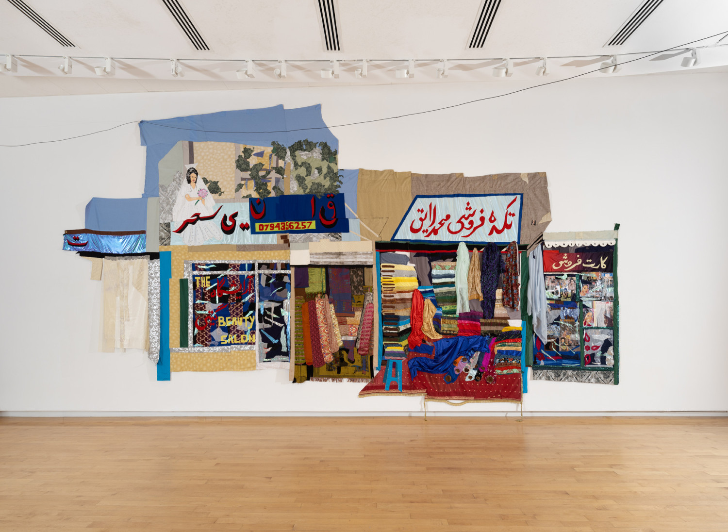 Bazaar. 2020 – cotton, chiffon, muslin, silk, suede, digitally woven textile, camouflage fabric, sari textile, inkjet prints on paper and canvas, paper, plastic, acrylic paint, marker, polyester, table cloth, faux leather, and found fabric – 168" x 312"