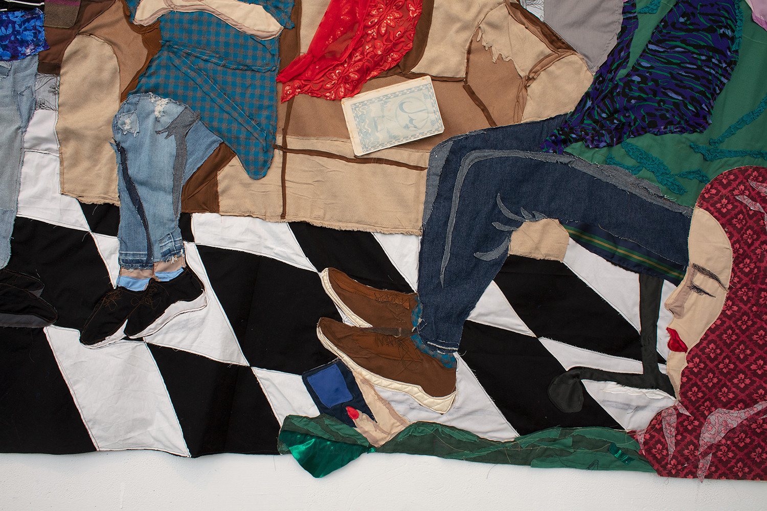 Untitled (detail). 2019 – chiffon, cotton, suede, silk, denim, mesh-screen textile, shoelace, hanging wires, bamboo cord, printed paper image, and found fabrics – 117" x 288"