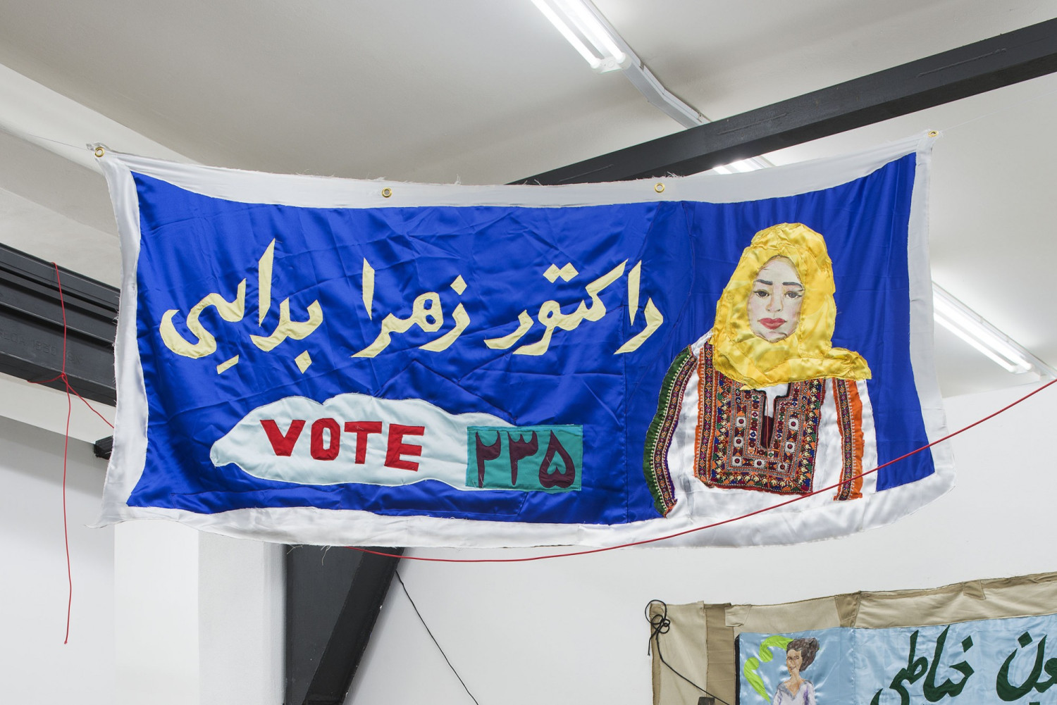 Vote. 2020 – cotton, chiffon, muslin, silk, suede, and handmade Afghan embroidered fabric – 41" x 84"