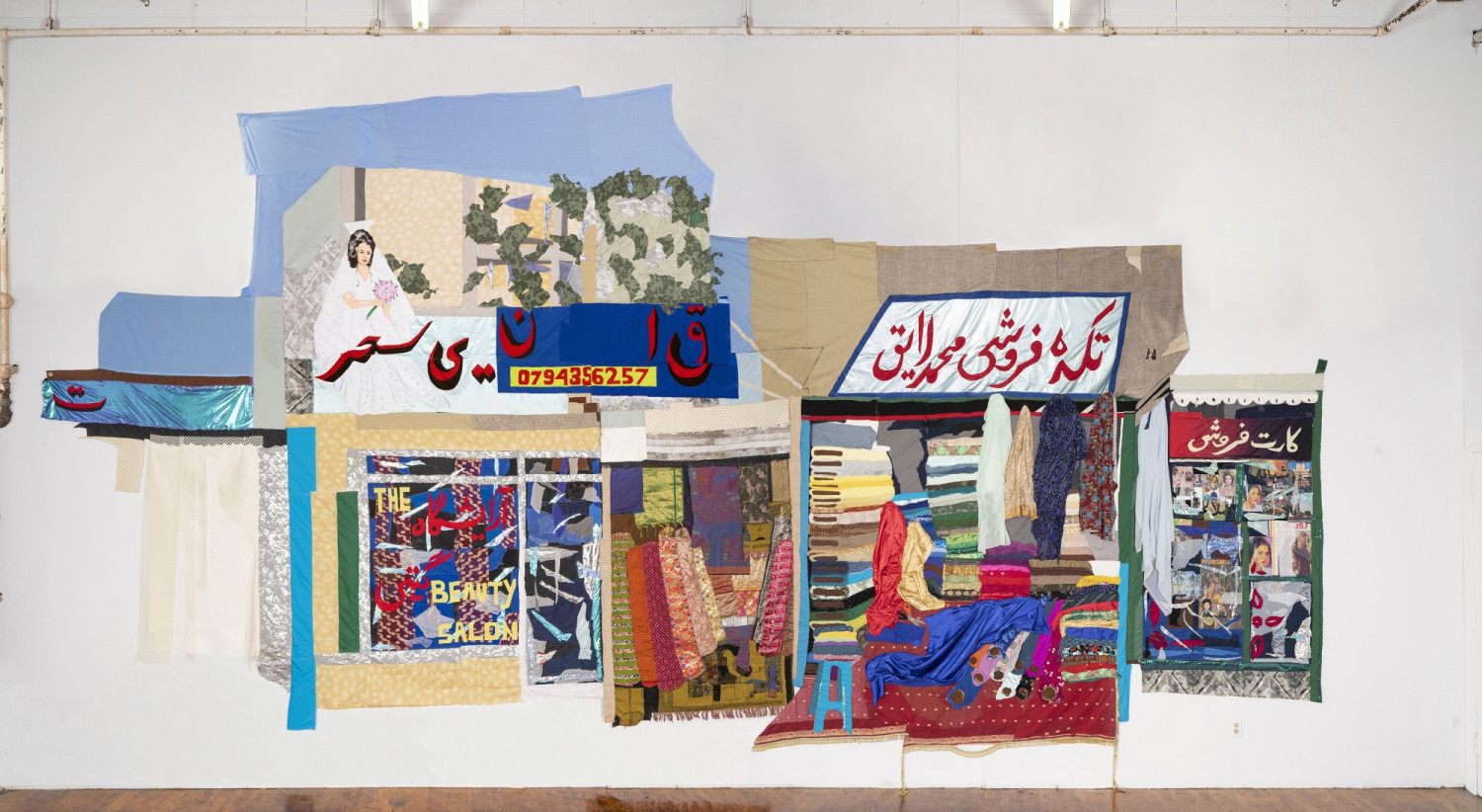 Bazaar. 2020 – cotton, chiffon, muslin, silk, suede, digitally woven textile, camouflage fabric, sari textile, inkjet prints on paper and canvas, paper, plastic, acrylic paint, marker, polyester, table cloth, faux leather, and found fabric – 168" x 312"