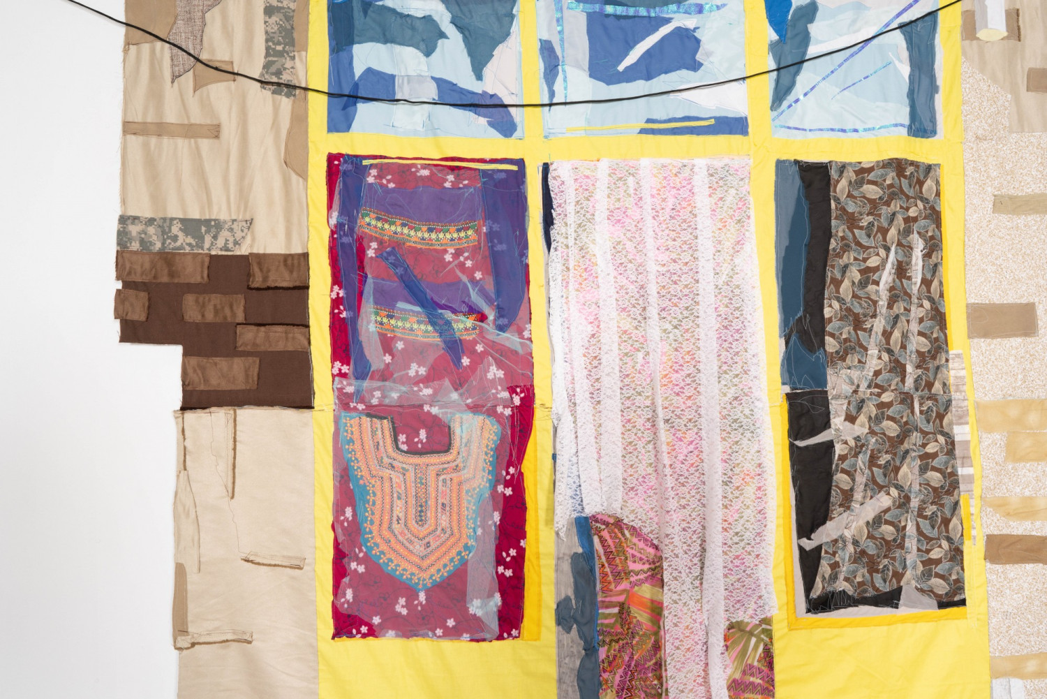 Malalai, Tailor Shop (detail). 2020 – cotton, chiffon, muslin, silk, suede, handmade Afghan embroidered fabric, shoelaces, acrylic paint, lace, gouache, marker, polyester, camouflage fabric, iridescent paper, and found fabric – 108" x 85"