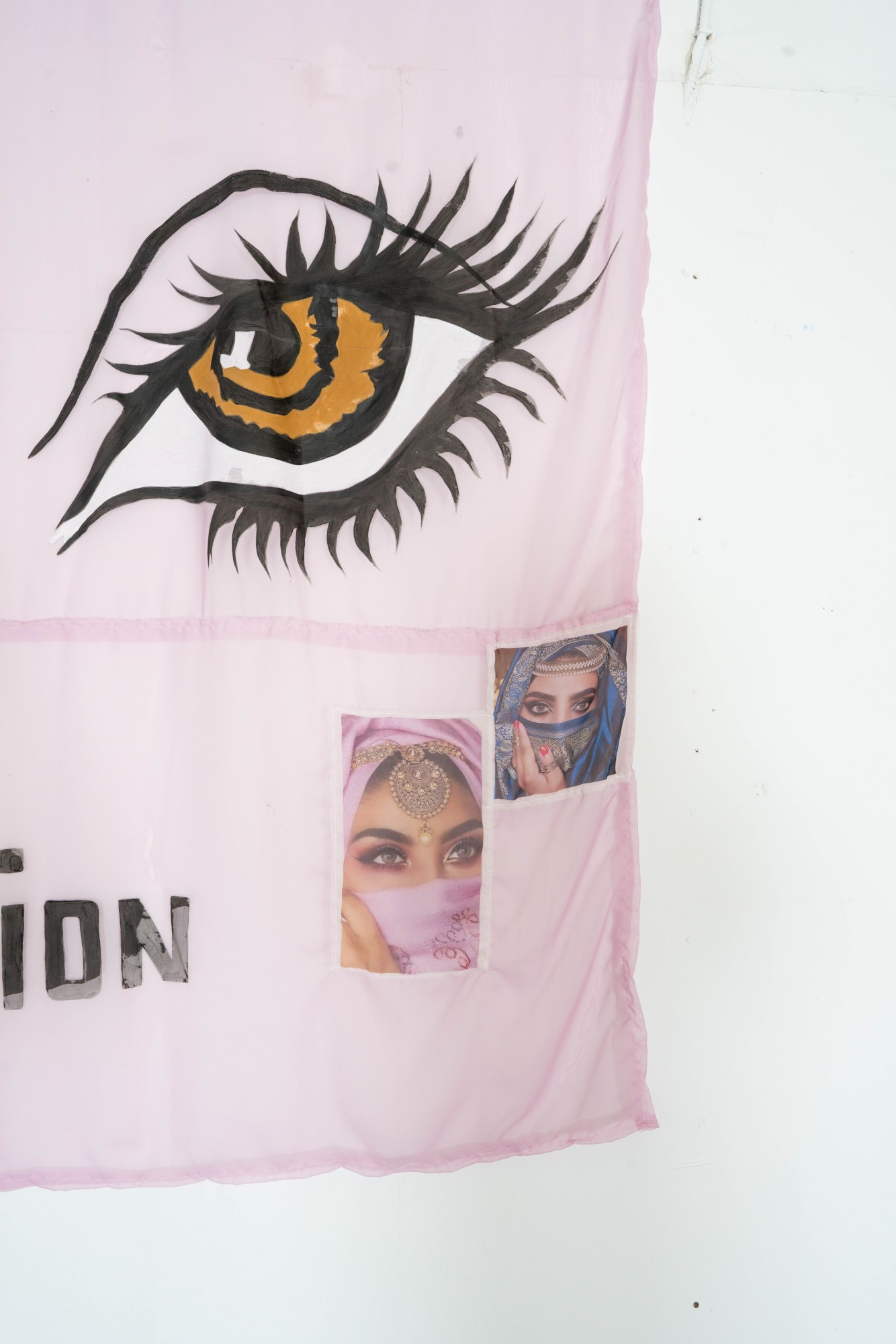 Sahar, Nail Salon and Eyelash Extensions #3 (detail). 2020 – chiffon, acrylic paint, and inkjet prints on silk – 122.5" x 85.5"