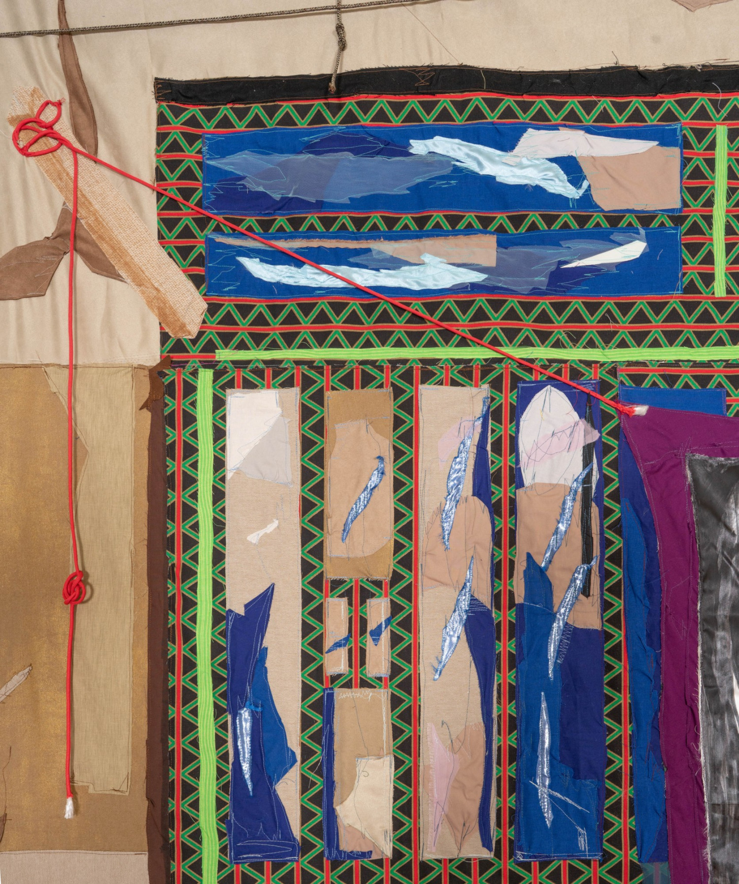 Madam, Mariam Beauty Salon (detail). 2020 – cotton, chiffon, muslin, silk, suede, shoelaces, camouflage fabric, inkjet prints on paper, marker, polyester, and found fabric – 111" x 87"