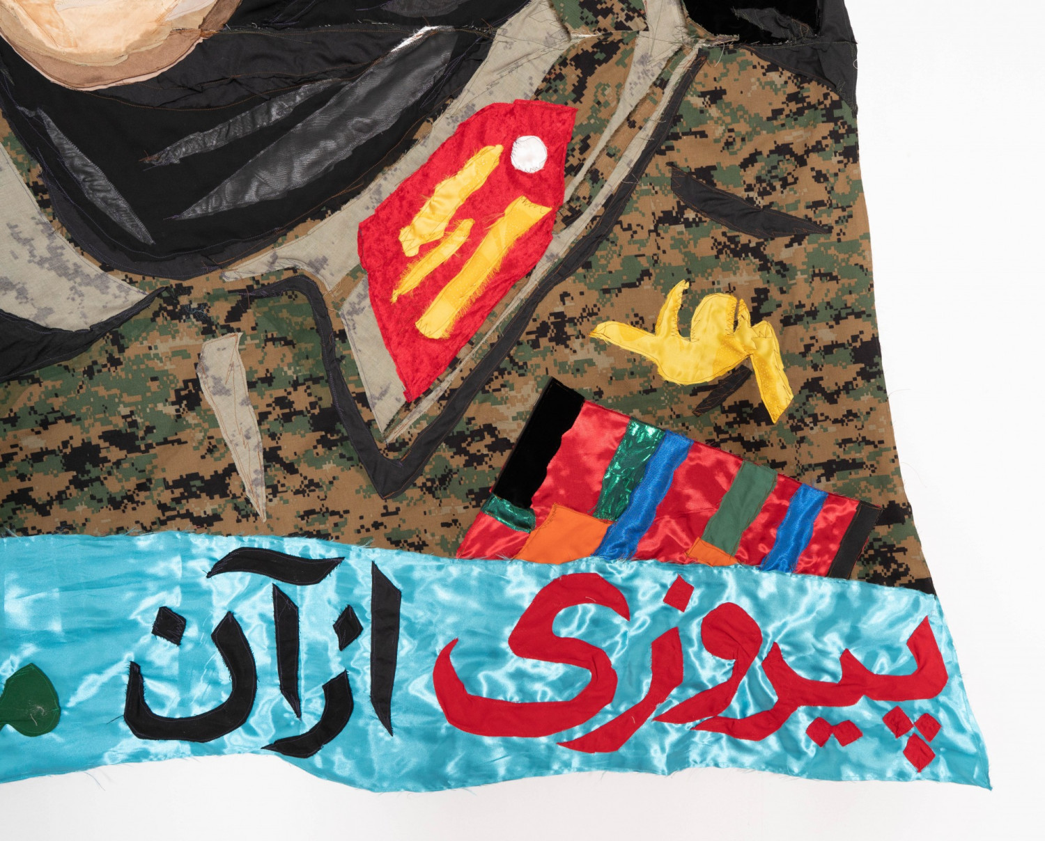 Khatool Muhammadzai, The Victory is Ours (detail). 2020 – cotton, chiffon, muslin, polyester, velvet, silk, suede, camouflage fabric, gouache, and marker – 84" x 64"