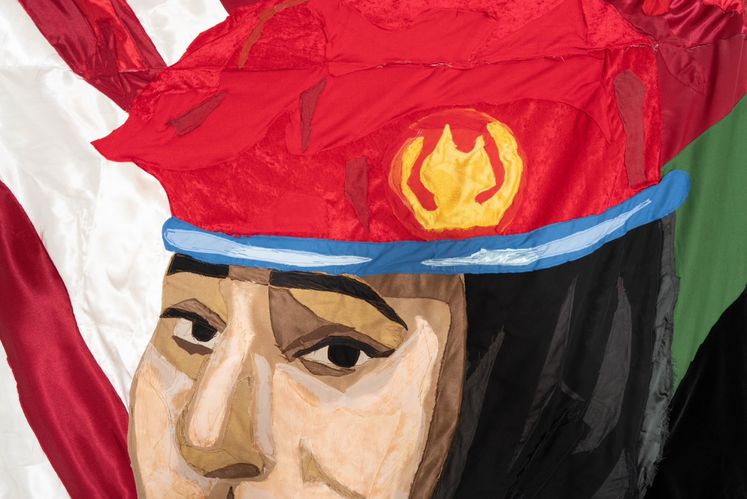 Khatool Muhammadzai, The Victory is Ours (detail). 2020 – cotton, chiffon, muslin, polyester, velvet, silk, suede, camouflage fabric, gouache, and marker – 84" x 64"