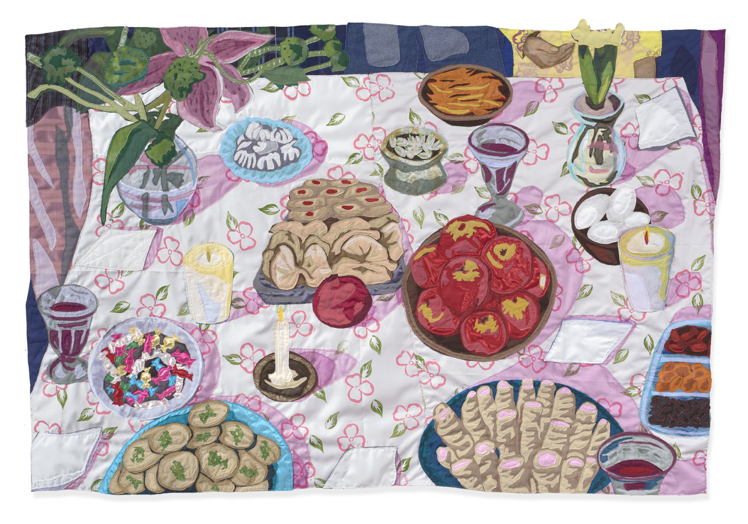 Nawruz/ New Day. 2025 – Muslin, cotton, chiffon, canvas, denim, silk, polyester, inkjet-print on silk-chiffon, block-print, color-pencil and acrylic paint on fabric – 40''H x 60''W