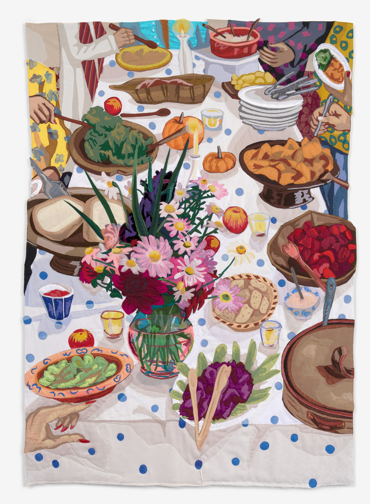 The Dinner Table. 2024 – Denim, cotton, chiffon, linen, muslin, silk, dye canvas, polyester, gauze, velvet, mesh polyester, and Jack Lenor Larson fabrics – 77.5"H x 55"W
