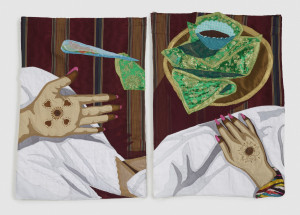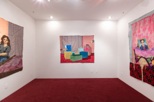"In this new body of work, Amiri sensitively explores the complex interior landscapes of domestic spaces. Through imagery that honors close bonds and togetherness, she places particular emphasis on women within these spaces, a subtle form of resistance against the reality of limited rights and visibility of women in Afghanistan under Taliban rule. Amiri’s piercingly tender textile works focus on the passage from room to room within the home, emblematic of transitions through life, and the family rituals and traditions that take place there.