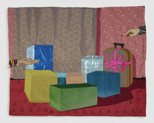 Still-Life with Jewelry boxes and Red Roses. 2022 – Chiffon, muslin, cotton, polyester, silk, inkjet print on chiffon, suede, color pencil, and found fabric – 62" X 53.5"