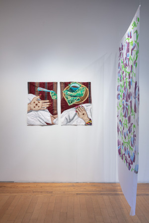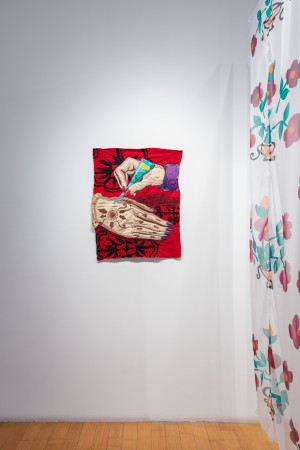personal memories of her mother who regularly sewed and mended, and the women who were vital to the support and survival of the artist’s family when they arrived as refugees to Canada, Amiri’s painterly approach to textile and its links to women throughout history is also a statement of resilience." (This exhibition is curated with Kate Mothes, an independent curator and founder of Young Space, currently based in Edinburgh, Scotland.)