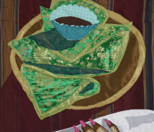 Still-Life with Vanilla Cake (detail). 2022 – Chiffon, muslin, cotton, polyester, silk, iridescent paper, suede, and found fabric – 50" X 61"