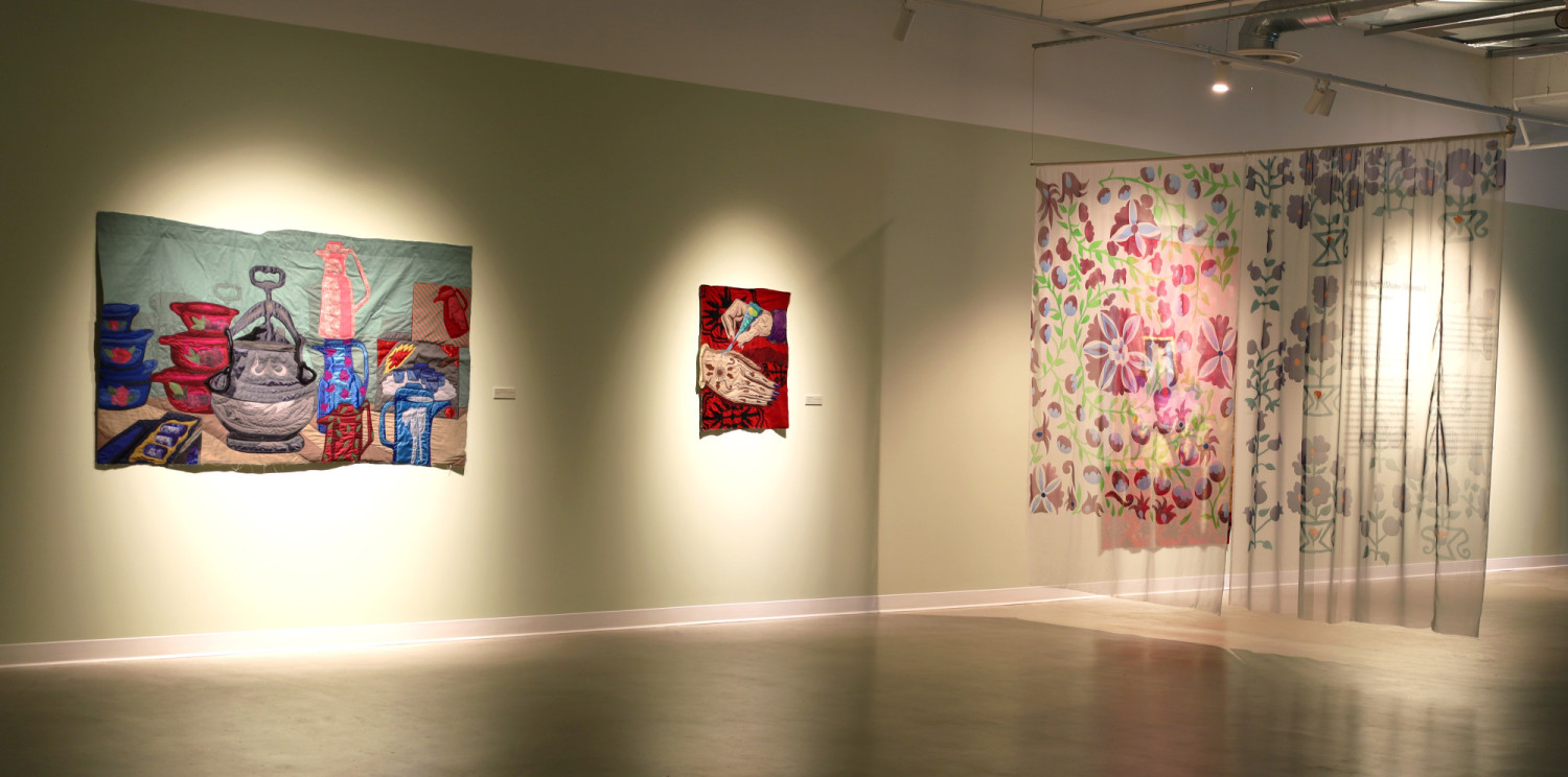 Installation view of Hangama Amiri: Henna Night II / Shabe Kheena II. Vancouver, 2025. © Parastoo Shahrestani. Courtesy of VIVA Alliance and Medias Res Gallery.