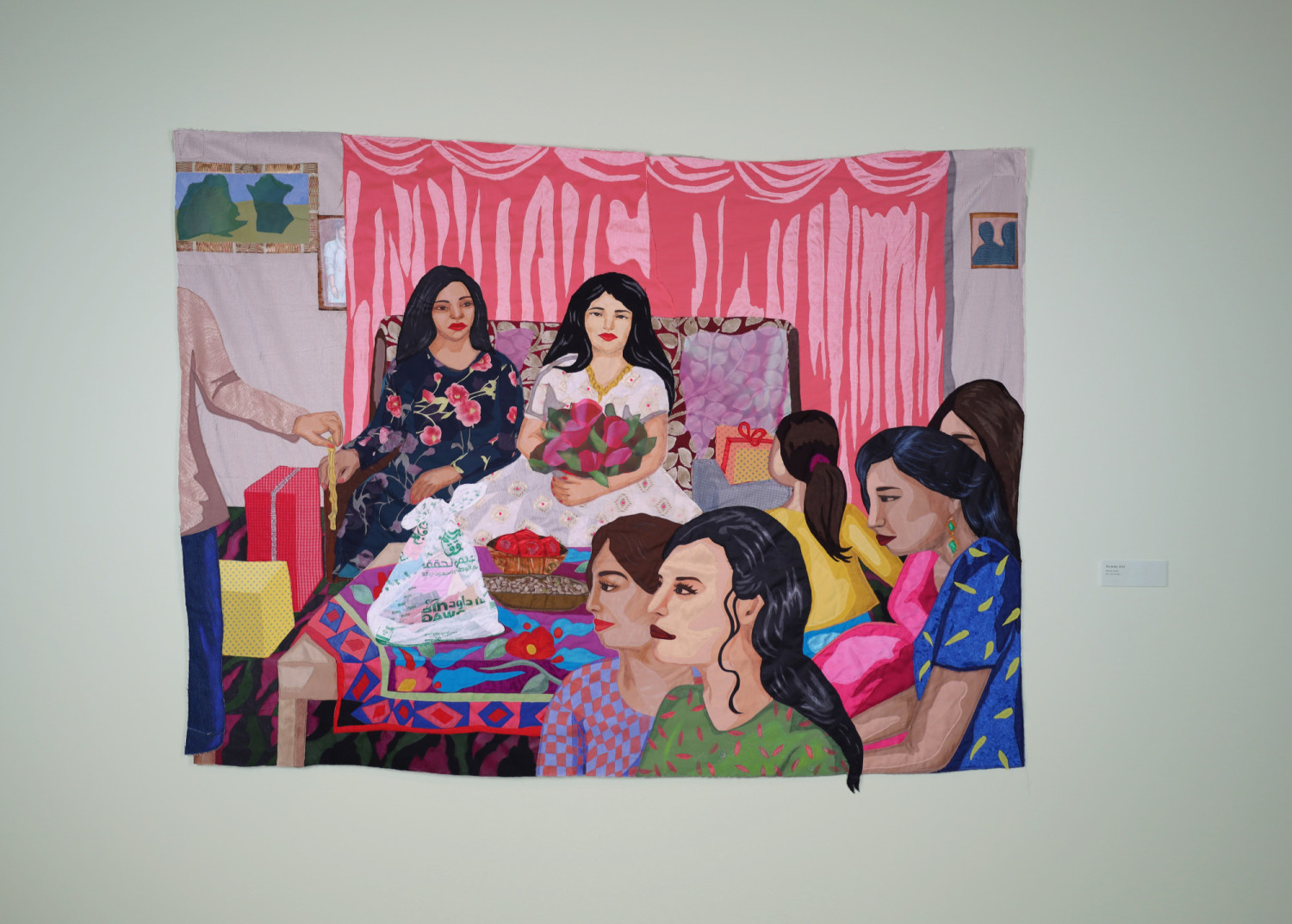The Bride. 2025 – Muslin, cotton, chiffon, polyester, velvet, suede, plastic bag, paper, inkjet print on silk-chiffon, silk, pencil and acrylic paint on fabric – 46"H x 66"W