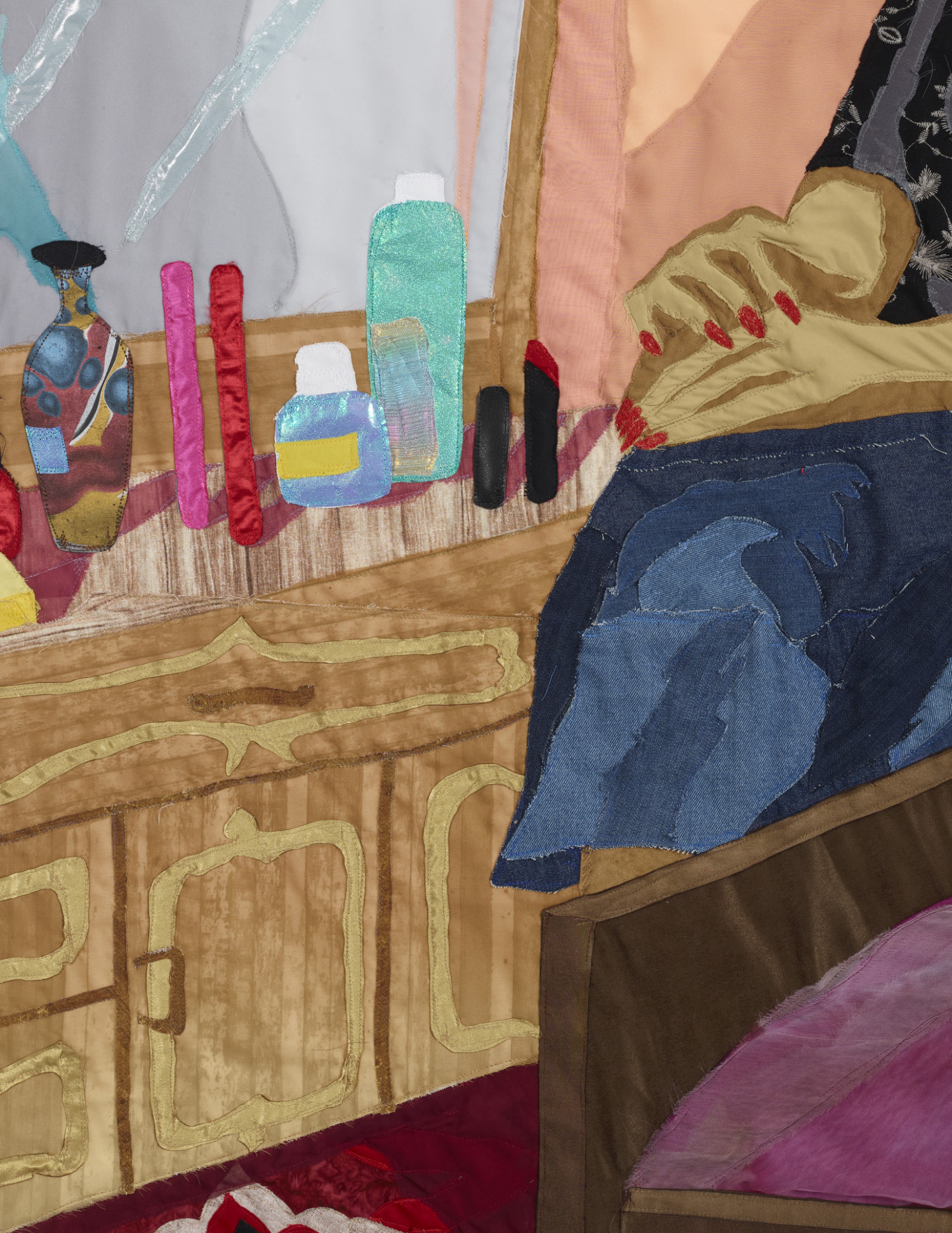 Her Dressing Table (detail). 2022 – Chiffon, muslin, cotton, polyester, silk, inkjet print on chiffon, iridescent paper, denim, suede, and found fabric – 67.5" X 58"