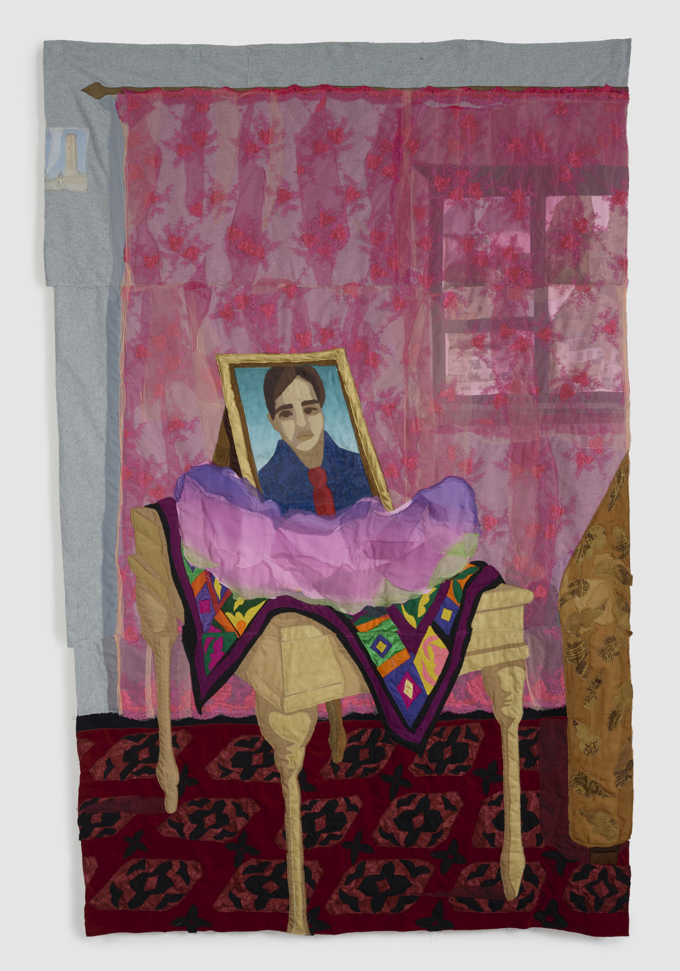 Photo of a Groom. 2022 – Chiffon, muslin, cotton, polyester, silk, velvet, dye cotton, suede, clear vinyl, postcard, and found fabric – 85" X 52.5"