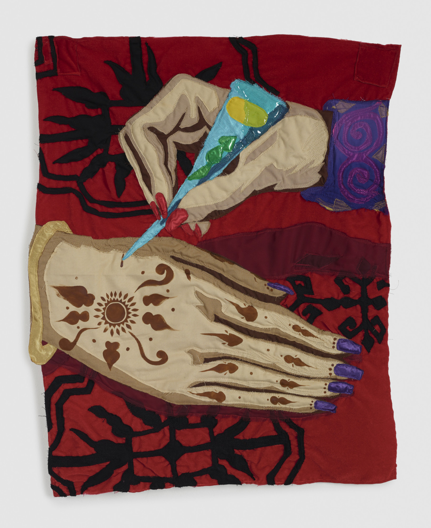 Henna Painting. 2022 – Chiffon, muslin, cotton, polyester, silk, vinyl, and acrylic paint on fabric – 31" X 24.5"