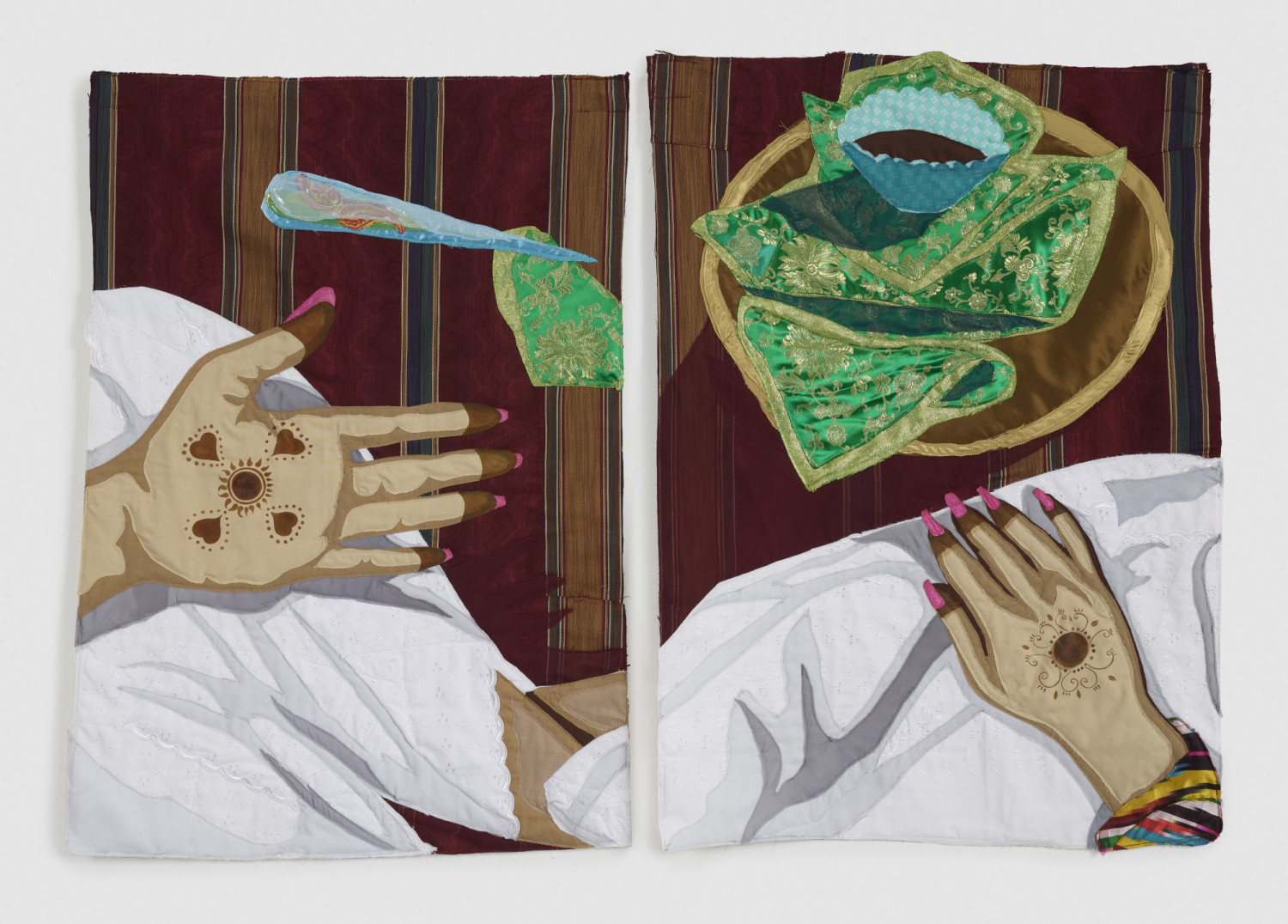 Still-Life with Henna (Diptych). 2022 – Chiffon, muslin, cotton, polyester, silk, acrylic paint on fabric, Ikat print, and found fabric – 33" X 24" (single piece)