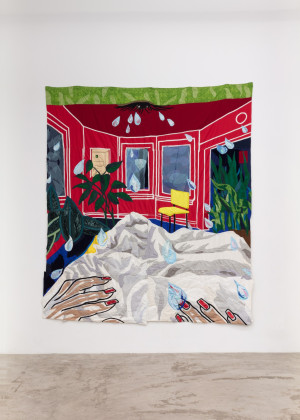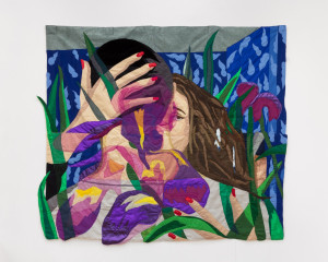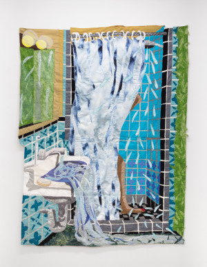 Late by Myself. 2021 – Chiffon, muslin, cotton, polyester, silk, suede, and color pencil – 92" X 79"
