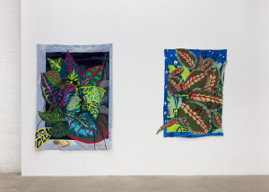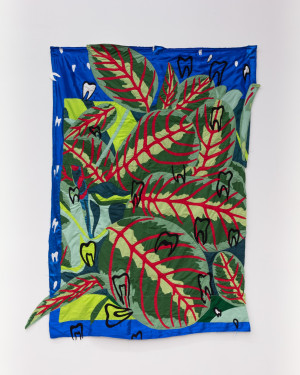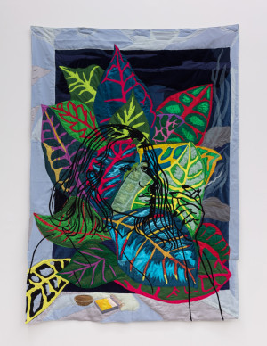 Self-Portrait with the Croton Petra Plant. 2021 – Chiffon, muslin, cotton, polyester, silk, velvet, net mesh, color pencil, and found fabric – 80" X 58
